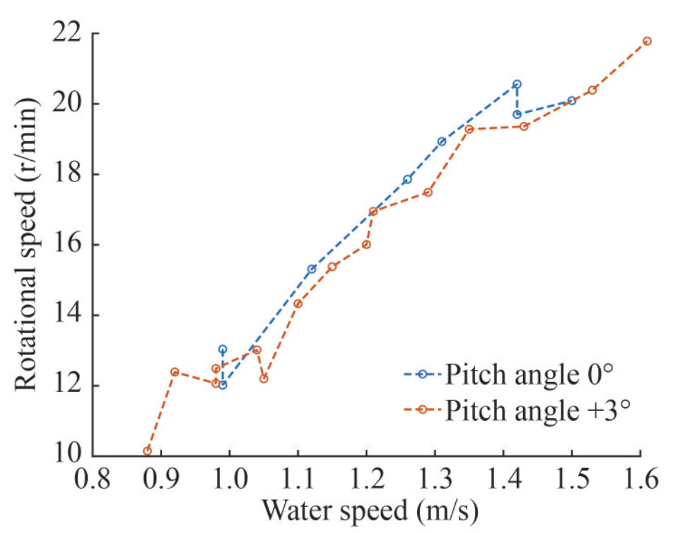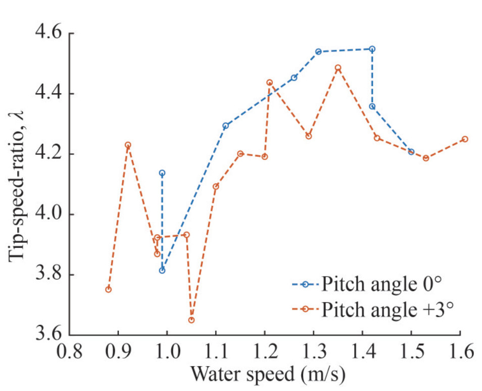 The turbine was operated without load for 30 min at water speeds below and above the turbine rating of 1.35 m/s. The tip-speed ratio for each experiment is calculated from the average of the measured water speed and the average of the measured rotational speed of the turbine. Eight measurements were made for a pitch angle of 0° at water speeds from 0.99 m/s to 1.53 m/s. A total of 15 measurements were made for a pitch angle of 3° at water speeds from 0.88 m/s to 1.61 m/s.