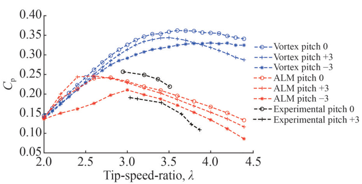 The tip-speed ratios with the highest CP -values (λopt) for each pitch angle are listed in Table 3. The ALM and vortex models predict a higher λopt for the lowest investigated pitch angle. However, the experiments show a slightly higher λopt for +3° pitch angle compared with the 0° pitch angle, but the difference is quite small.