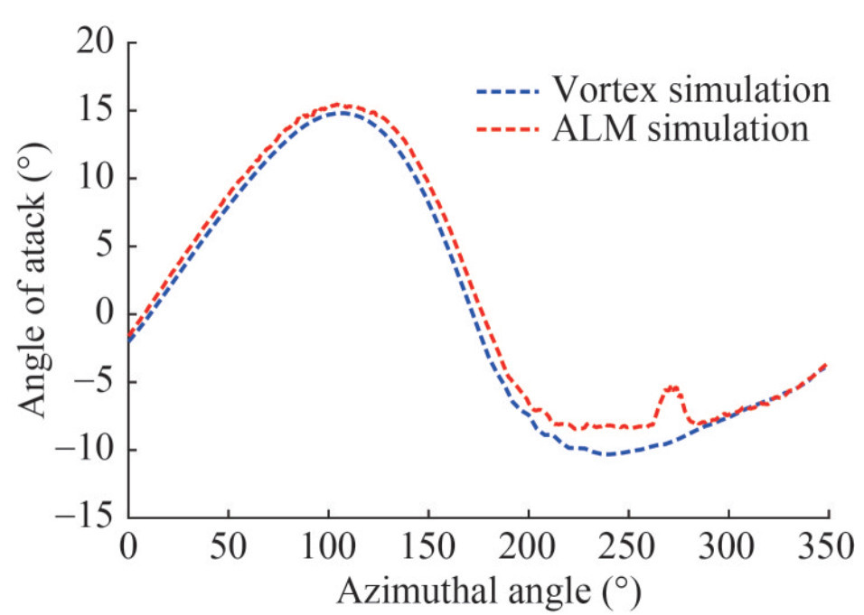 Figure 9 shows the angle of attack as a function of the azimuthal angle for one revolution for both simulation models at a pitch angle of 0° and tip-speed ratio of 3.4. The results are summarized in Table 4.