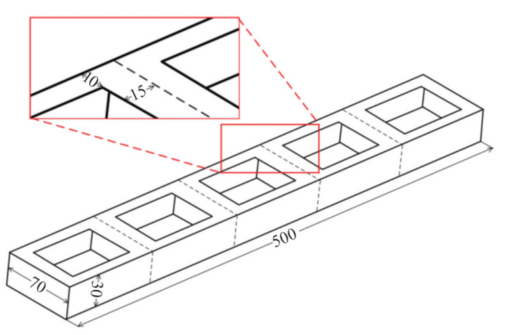 The structural layout of the ship hull girder is depicted in Figure 1 to investigate the structural response of the ship hull girder to blast waves generated by underwater explosions. The ship hull girder is constructed from Q235 material and measures 0.5 m × 0.07 m × 0.03 m. This girder comprises five cabins, each containing a rectangular groove. The distances between the rectangular grooves and the outer surface of the ship hull girder are 15 and 10 mm, respectively, with all steel plates having a thickness of 1 mm. The layout of the explosion test is illustrated in Figure 2. The ship model is placed on the surface of the water, with a draft reaching half the model's depth. A 4 g explosive is placed under the central part of the ship hull girder, with h representing the explosion distance. The parameters for the simulation test, which ensure model accuracy, are listed in Table 1.