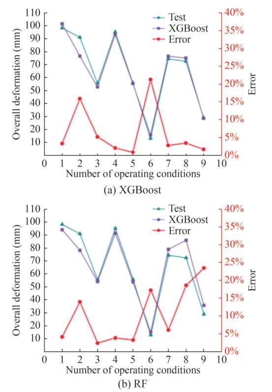 The prediction results are used to estimate the maximum deformation of the bulge in the central area of the ship hull girder. Figure 13 depicts the prediction results and error curves derived from the testing sets of the XGBoost and RF models. Both models accurately predict the deformation trend, as indicated by the error curves. However, the errors in the 6th and 9th groups of working conditions in the RF model are relatively large, primarily due to the small true value of prediction. This study assesses the predictive performance and test data to provide insights into accuracy more comprehensively.