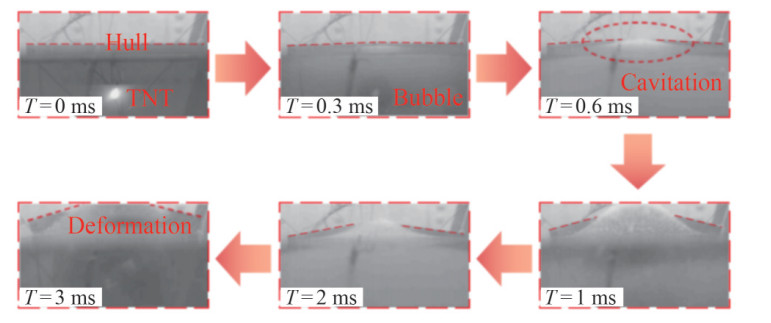 Table 1 Working condition parameter of the underwater explosionWorking condition serial number Explosion distance (mm) Explosive type Equivalent weight (g) 1 50 TNT 4 2 75 TNT 4 3 100 TNT 4 2.2 Experimental result