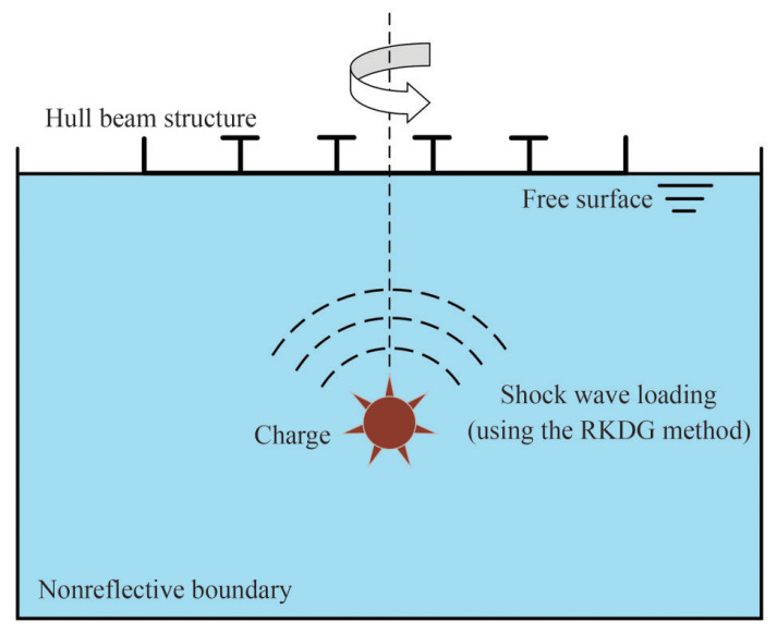 This study employs a combination of the RKDG method and finite element analysis to achieve high-precision calculations. A numerical simulation of two-dimensional underwater explosive loads is performed using the RKDG method. The pressure–time curve of the blast wave is recorded, and a finite element model of the structure is then created in the commercial finite element software, ABAQUS, for coupling. Finally, ABAQUS is applied to calculate the nonlinear response of the structure.