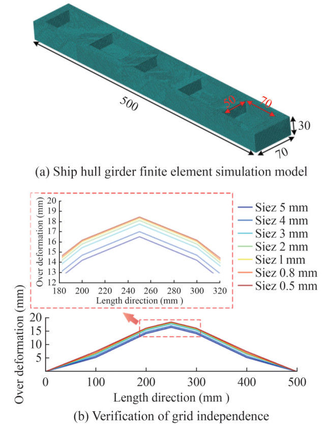 The numerical ship hull girder model, shown in Figure 5(a), features a water area with dimensions of 5 m × 3 m × 3 m. Free boundaries are assigned to the upper surface of the water area, while nonreflective boundaries are applied to the other surfaces. Simulations are conducted under various working conditions, with TNT spherical charges located underwater at depths of 50, 75, and 100 mm, consistent with the experimental setup. For grid division, the model uses AC3D4 acoustic tetrahedron elements to represent the water area. A grid convergence analysis is performed to verify the rationality of the grid sizes. Seven sets of mesh sizes are selected for the simulation, ranging from 5 mm × 5 mm × 5 mm down to 0.5 mm × 0.5 mm × 0.5 mm, to minimize the impact of mesh resolution on the numerical results. The simulation results, presented in Figure 5(b), indicate that as the mesh size decreases and the number of mesh elements increases, the maximum deformation of the hull beam structure gradually increases. However, when the mesh size is reduced from 1 mm × 1 mm × 1 mm to 0.5 mm × 0.5 mm × 0.5 mm, the change in maximum deformation becomes negligible, despite a remarkable increase in computational cost. This finding suggests that reducing the mesh size below 1 mm offers minimal improvements in accuracy while extensively increasing computational expenses. Therefore, the mesh size was finalized at 1 mm × 1 mm × 1 mm. Additionally, the blast wave loads calculated using the discontinuous Galerkin method are imported into the simulation software for further analysis due to limitations in commercial software.
