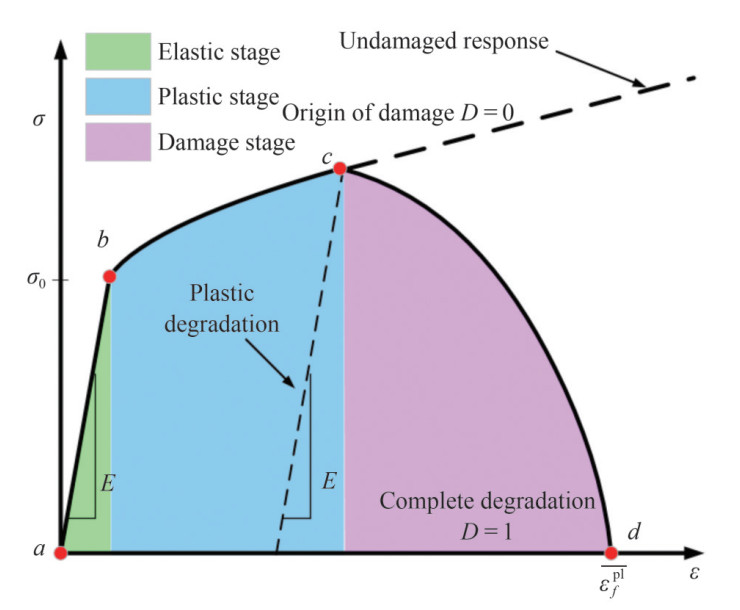 In finite element simulations, plastic constitutive and damage models are commonly used to simulate and illustrate material deformation during impact response. Figure 6 illustrates the relationship between the material's stress and strain, highlighting three stages: the elastic stage (a–b), the plastic stage (b–c), and the damage evolution stage (c–d). This study uses the Johnson–Cook constitutive model for the finite element simulation of Q235 (Cao et al., 2020). The model presents a relational expression for the equivalent stress, equivalent plastic strain, equivalent plastic strain rate, and temperature, as shown in Eq. (7):