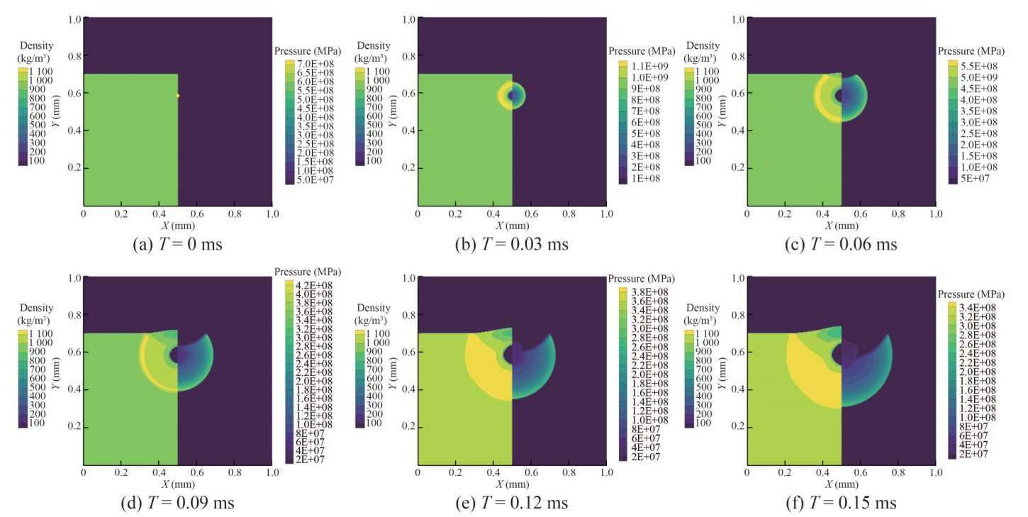 The underwater explosion model is designed based on the experimental model presented in Figure 4. The fluid area measures 1.2 m × 1.2 m. The charge model comprises a spherical charge with a radius of r = 8.4 mm and an equivalent weight of 4 g. As indicated in the figure, the coordinates designate the origin (point O) and the central coordinate of the spherical charge (0, 0.6). The model uses a square grid with uniform distribution, with each grid measuring 1.67 mm, totaling 518 400 grids. The initiation mode of the spherical charge is center priming. Multiple RKDG solver models are used for the numerical simulation, with a nonreflective boundary set for the outer domain boundary in this model.