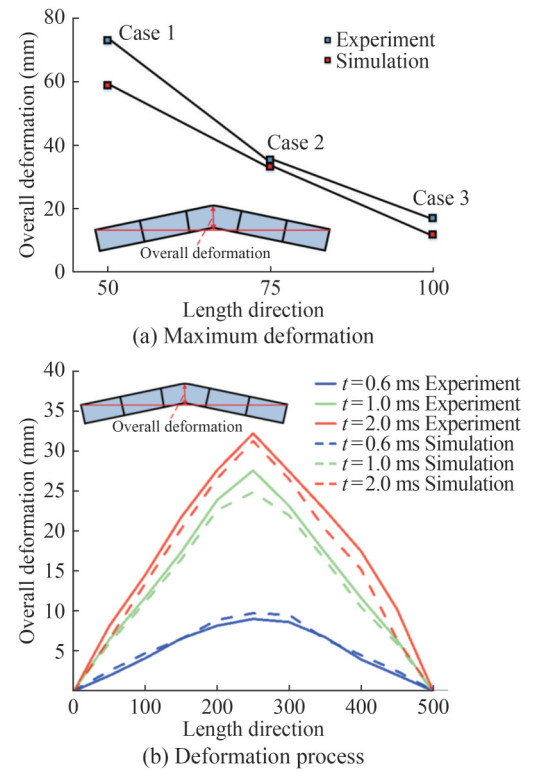 Figure 9(a) displays a curve comparing the maximum deformation of the ship hull girder from numerical simulations and experimental results. The curve indicates a reduction in final deformation with increasing explosion distance and demonstrates relatively good alignment between the numerical and experimental results. The maximum deformation errors for three cases are as follows: Case 1: 19.8%; Case 2: 7.8%; and Case 3: 14.6%. Taking Case 2 as an example, Figure 9(b) compares the hull beam deformation process between the numerical model and the experimental results. When the hull beam is subjected to shock wave loading, deformation occurs in the middle section of the hull beam. In the first 0.6 ms, the maximum deformation is relatively small, accounting for only 29% of the final deformation, revealing a slow structural deformation rate. Between 0.6 and 1 ms, the deformation rate substantially increases, reaching half of the final deformation. This finding is primarily due to the formation of a plastic hinge in the middle section of the hull beam, resulting from earlier structural deformation, weakening the structural strength. The hull beam reaches its maximum deformation at 2 ms. As shown in Figure 9(b), the numerical model agrees well with the experimental results throughout the hull beam deformation process.