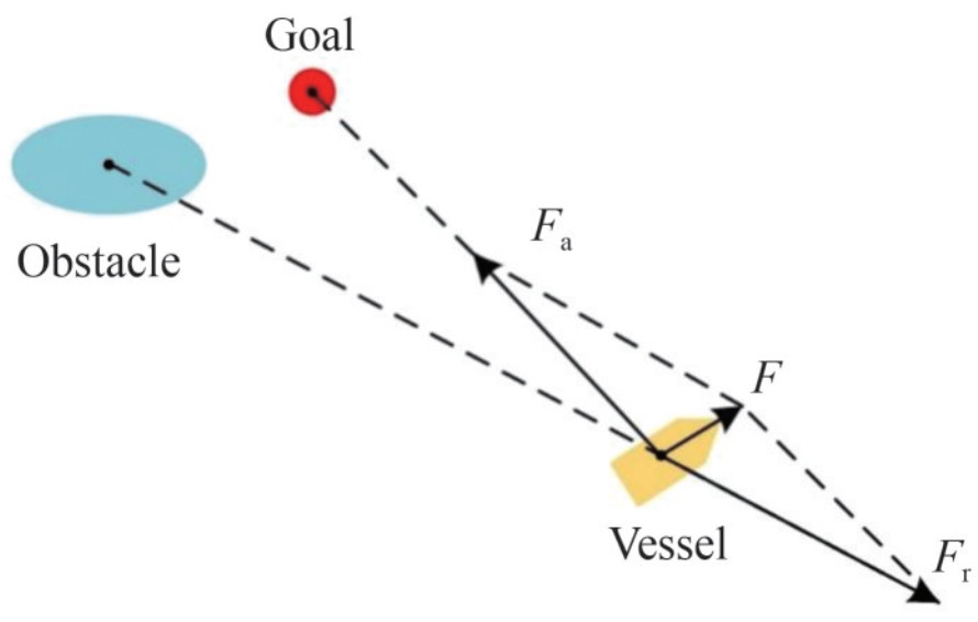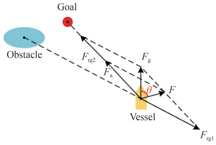 $$ F = {F_{\rm{a}}} + \sum\limits_{i = 1}^n {F_{\rm{r}}^i} $$ (7) where i is the number of obstacles and Fri the repulsive force of the ith obstacle on the ERRV.