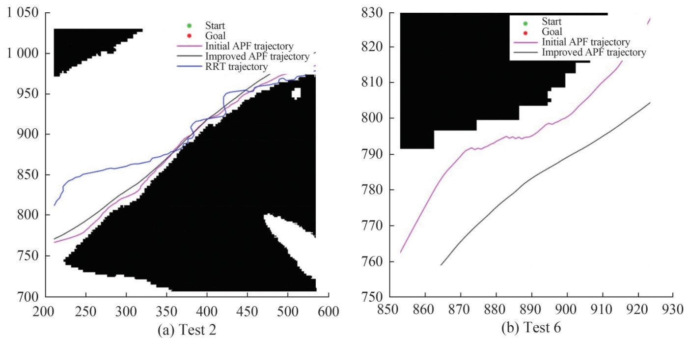 Table 5 Test resultsArea Test Iterations Time (s) Traditional APF Improved APF RRT Traditional APF Improved APF RRT Area 1 Test 1 10 000 2 543 1 848 - 8.371 155 78.109 541 Test 2 1 326 1 245 949 8.556 581 8.382 733 16.036 974 Test 3 10 000 2 736 2 328 - 8.434 149 163.684 541 Test 4 10 000 1 609 1 521 - 8.574 522 20.326 345 Area 2 Test 5 10 000 1 401 3 193 - 8.009 598 147.311 668 Test 6 1 584 1 579 10 000 8.261 899 8.221 996 - Test 7 10 000 1 275 10 000 - 8.029 031 54.417 055 Test 8 10 000 1 789 550 - 8.041 158 29.760 504 6 Discussion