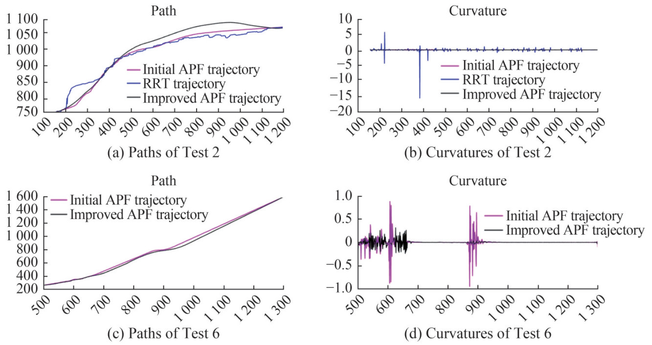 A comparison of the planned paths of tests 2 and 6 were shown in Figures 12 and 13 by calculating the curvatures of the entire paths. All algorithms were successful in providing the planned paths for test 2. Significantly, all APF algorithms planned smoother paths than RRTs, as shown in Figure 12(a), 13(a), and 13(b), which is consistent with Gu et al. (2023). Furthermore, a comparison of the two planned paths in tests 6 indicated that the paths estimated by the improved APF algorithm had the smallest curvature float range. The trajectory estimated by the traditional APF were affected by the irregular edges of the obstacles, which moved around the obstacles, as shown in Figure 12(b). The improved APF algorithm suggested an optimized path to elude obstacles, resulting in smoother path. In test 6, the curvature of the initial APF trajectory was even above 1, while the curvature of the improved APF trajectory was always fluctuating around 0, as shown in Figures 13(c)-13(d).
