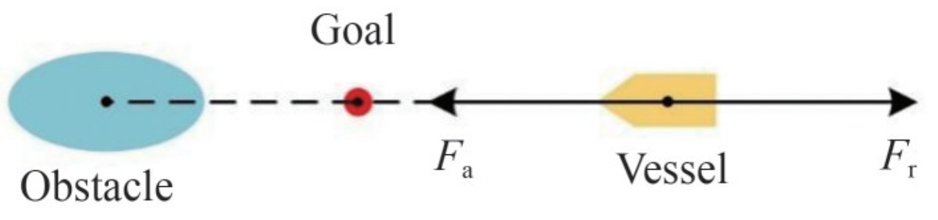 The traditional APF method benefits from concise modeling, high efficiency, and rapid speed of convergence, which can satisfy the local dynamic obstacle avoidance of the ERRV. Nevertheless, the traditional APF method has planning failures in some cases. For example, when the distance between the goal and the obstacle is close, the gravitational force tends to reduce and the repulsive force increases. The path planning could fail as the combined forces of the ERRV are directed away from the goal (see Figure 1). If the combined force on the ERRV is 0 or if the gravitational and repulsive forces are co-linear (see Figure 2), the vessel will appear to stall or wander in a localized area. Thus, it falls into a local minimum.