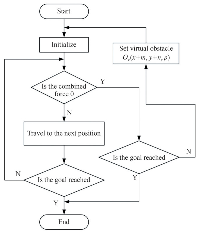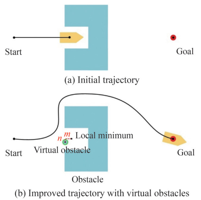 Large obstacles or U-shaped obstacles may cause local minimum issues, as the combined force could become 0 before reaching the goal. Virtual obstacles are set to address this flaw. The specific flow of the improved algorithm is shown in Figure 5. When the combined force of the ERRV is 0 in path planning, it is determined whether the goal is reached. If not, it is concluded that it is in a local minimum and the virtual obstacle will be set. The virtual obstacle is a solid circle with radius ρ and center's coordinates (x + m, y + n), denoted as Ov(x + m, y + n, ρ). Coordinates (x, y) is the coordinate of the local minimum point in this path planning. Virtual obstacles at (x, y) will fail to resolve the co-linear situation. Therefore, the virtual obstacle is set near the local minimum point by randomized correction parameters m and n. The vessel will not be stuck in this local minimum further, as shown in Figure 6(b). With this virtual obstacle in place, the path is re-planned and the combined force detection mentioned above is repeated. If a local minimum issue occurs again, new virtual obstacles will be set until the goal is reached.