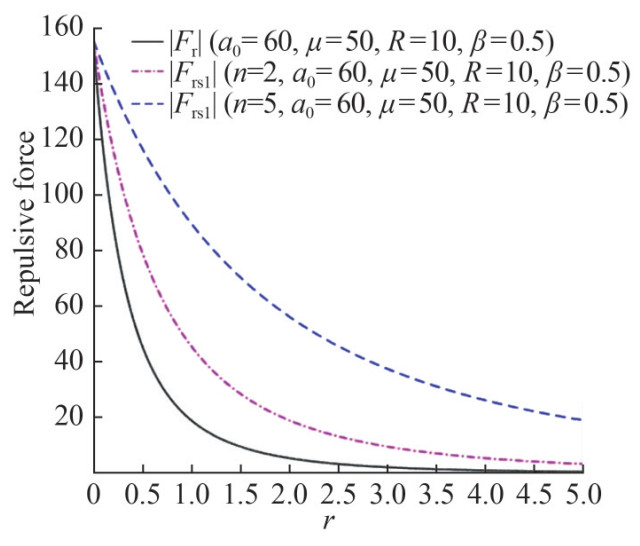 $$ \left|F_{\mathrm{rs} 1}\right|=\left(\frac{1}{r / n+1}-\frac{1}{\alpha_0}\right) \frac{\mu R^\beta}{(r / n+1)^2} $$ (16) The repulsive effect of the goal on the ERRV (Frs2) is not taken into account. The magnitude of the repulsive force varies more smoothly with the improvement. n determines how the repulsive forces vary smoothly with r. The repulsive force on the ERRV is similar to the original with smaller n, and change more smoothly with larger n (as shown in Figure 7).
