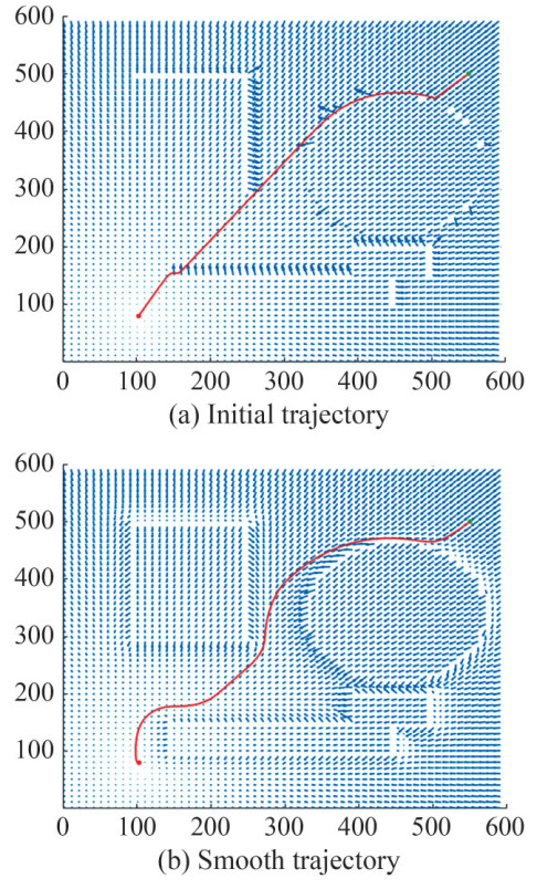 The response time and number of iterations for both algorithms are described in Table 5. The results demonstrated that all APF algorithms performed more efficiently than the RRT algorithm significantly, which is consistent with Li et al. (2021). In test 2, the trajectory estimated by the improved APF algorithm was solved with 1 245 iterations, which was less than the traditional APF algorithm. This indicated that the relatively smoother path was solved by the improved algorithm in fewer steps. The response times of both APF algorithms were relatively close, but the time used by the improved APF algorithm (i. e., 8.38 s) was shorter than the traditional algorithm (i. e., 8.56 s). With the existing inland waterway GIS information, the improved APF algorithm responds quickly and successfully gives applicable paths for ERRVs.