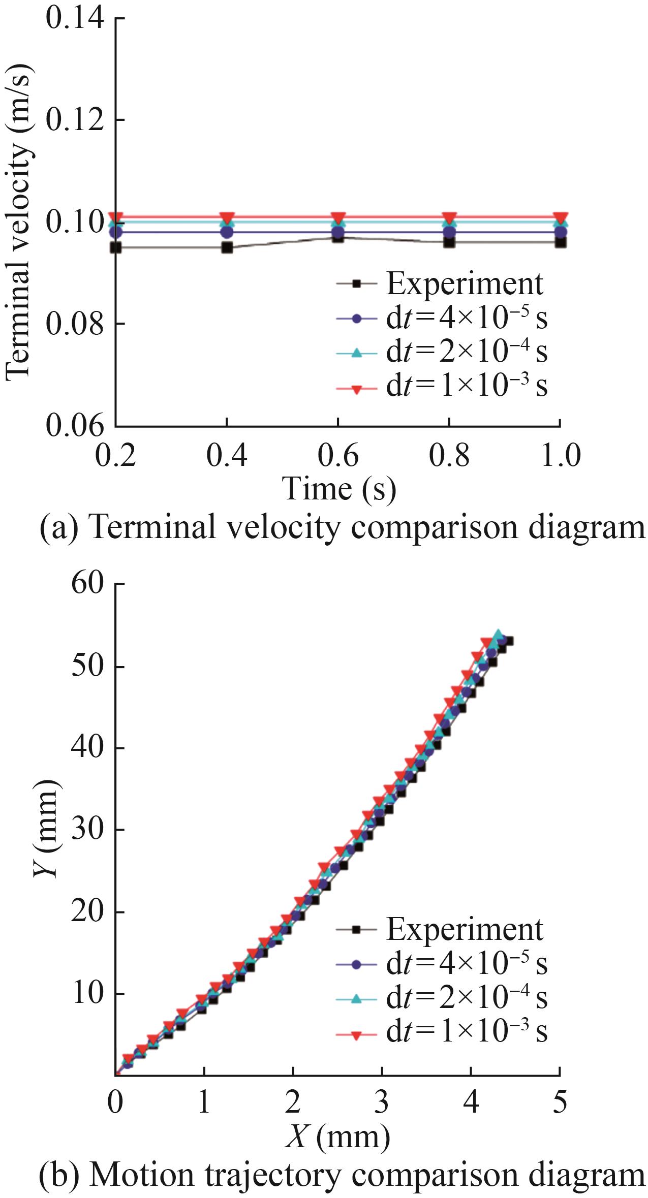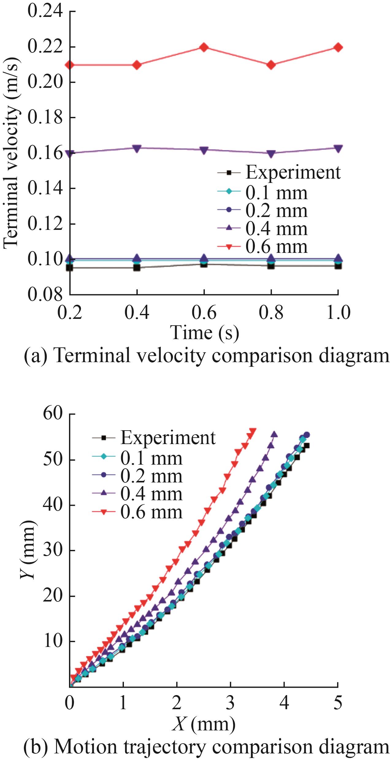 Figure 9 compares the terminal velocity and trajectory of the bubble under four mesh sizes with the experimental results. The velocity and trajectory obtained by 0.1 and 0.2 mm mesh sizes agree with the experimental results, and the error is approximately 5%. The larger the mesh size is, the faster the terminal velocity of the bubble is, and the trajectory is gradually messy. The calculation time of 0.1 mm mesh size is longer than that of 0.2 mm mesh size, and the efficiency is low.
