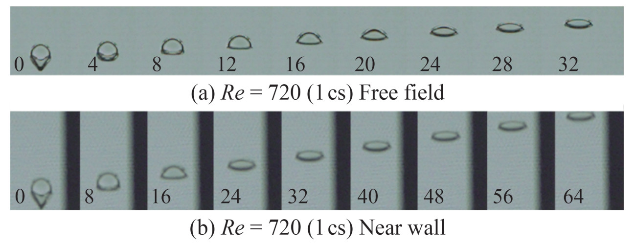 decreases due to the increase of viscosity, and in 1 000 cs silicone oil is only 0.04. After the bubble separates from the outlet hole, although the bottom cone area also shrinks upward, it keeps the bottom cone and shrinks slowly, and the shape of the upper half of the bubble remains unchanged. When the bottom is completely contracted, it is gradually rounded and reaches a stable state, and then it rises steadily. In general, the bubble deformation is very small. In 500 and 1 000 cs viscosity silicone oil, the stable state is very close to the circular bubble. When the bubble approaches the solid surface, the shear stress of the fluid gradually increases. The velocity of the fluid near the wall generates a substantial gradient due to the viscous effect, which causes the bubble to produce local shear force when approaching the wall. This shear force typically concentrates on the surface of the bubble, especially near the wall. Under the action of high shear stress, the bubble undergoes asymmetric deformation. Near the wall, the fluid velocity is low, and the shear force on the bubble surface is strong, which may cause the bubble to flatten in the area near the wall, while the part away from the wall is subjected to small shear force, and the bubble shows a deformation in the direction of flow. For example, bubbles become elongated ellipsoids or hemispheres.