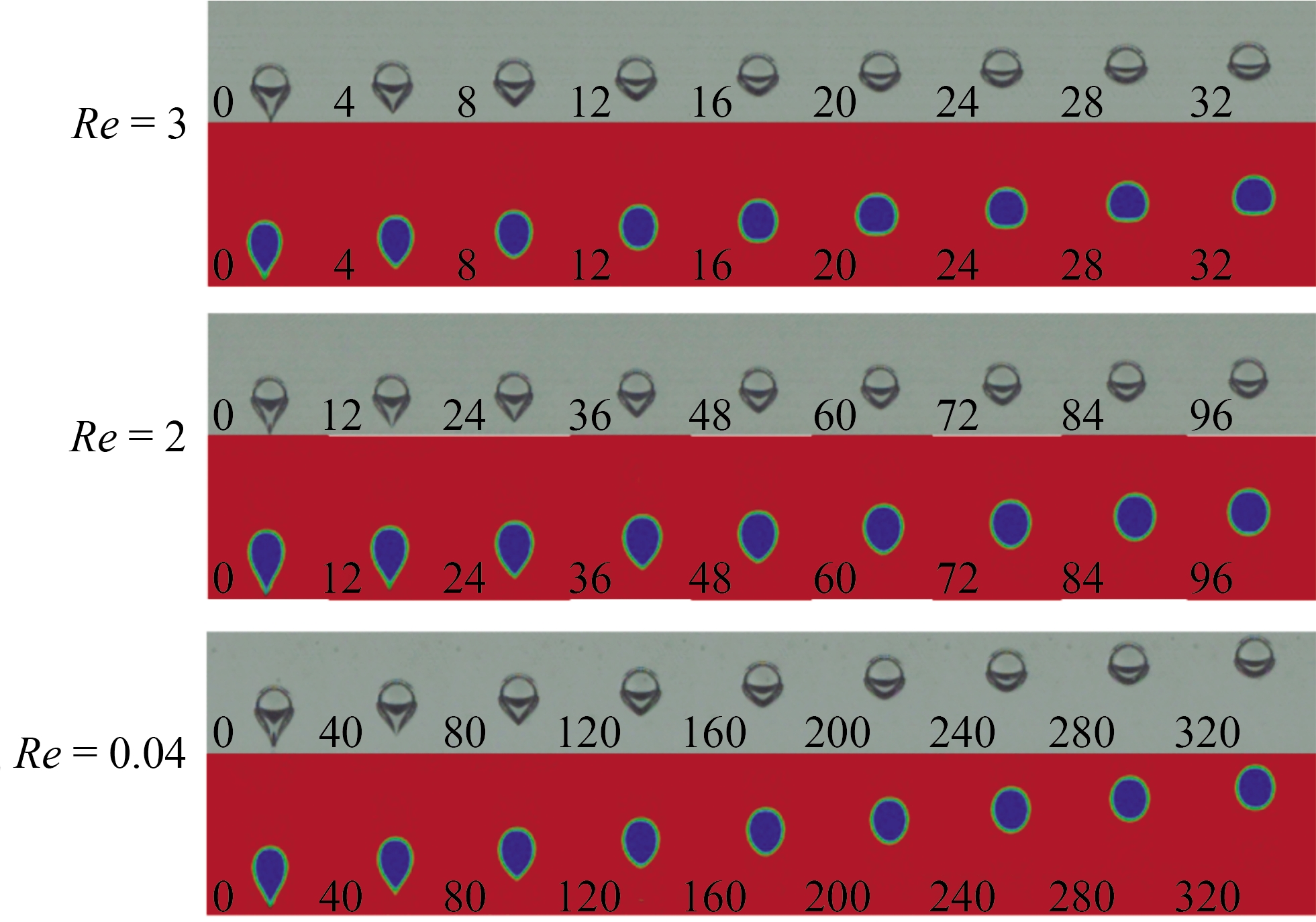 Next, this study focuses on the influence of different viscosity media on the dynamic characteristics of bubbles. Figure 12 compares the numerical and experimental changes of bubble morphology when floating in high-viscosity silicone oil. The left number in the figure is silicone oil with different viscosity parameters, and the lower left number is the image interception time in ms. For the morphological changes of floating bubbles in high-viscosity silicone oil, due to the increase of viscosity, the changes cannot be observed at the same time. Therefore, the morphological changes of bubbles in the three kinds of silicone oil intercepted in Figure 12 are different time distributions.