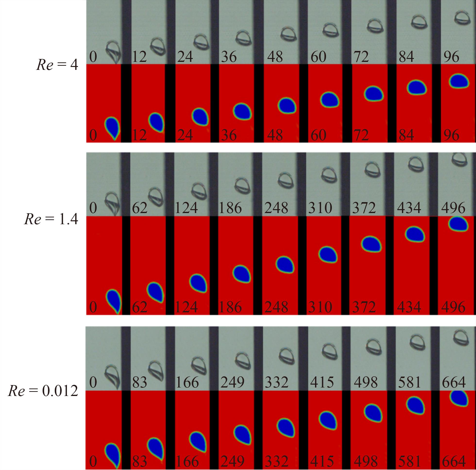 ) of these microbubbles is very low, between 0 and 10. However, most of the current research on microbubbles focuses on Re between 10 and . Thus, conducting basic research on floating microbubbles with is very important. At present, research methods such as theoretical analysis, experimental measurement, and numerical simulation are employed to study the velocity, deformation, rupture, and fusion characteristics of bubble floating. Corchero et al. (2006) experimentally examined the generation of bubbles by injecting a constant flow of air into an orifice immersed in water. Holes with different radii, including hydrophilicity and hydrophobicity, were drilled on horizontal plates of different materials to cover a series of static contact angles, and a wide range of volumetric gas flow rates were analyzed. The results show that the data of different static contact angles and orifice radii can be approximately simplified to a single bubble volume/flow association when the relationship between the appropriate proportion of detached bubble volume and the appropriate proportion of gas volume flow is drawn. Gong et al. (2020) constructed a visual bubble observation platform with an adjustable wall surface and observed the influence of wall surface with different inclination angles and wettability on bubble rising behavior. During the experiment, the velocity vector field of water around the rising bubble was obtained by particle image velocimetry. Through experiments, the instantaneous rising velocity, average rising velocity, and flow field around the bubble under different conditions were obtained, and the morphological changes of the bubble during rising were found. Takemura et al. (2002) experimentally measured the two components of the force acting on a clean near-spherical bubble rising on a near-plane vertical wall in a static liquid. A charge-coupled device (CCD) camera and a microscope were used to follow the rising bubbles. The device can accurately measure the radius of the bubble, the rising speed, and the distance between the bubble and the wall. Thus, the resistance and lift components of the hydrodynamic force are determined when (based on bubble diameter, rising velocity U, and kinematic viscosity ) is less than 40. Tian et al. (2019) experimentally examined the shape and rising velocity of bubbles in silicone oil and paraffin under the influence of high temperature and high pressure and proposed a new correlation of bubble aspect ratio. Rozario et al. (2018) used water and oil to represent liquid metal and slag, respectively. They simulated the bubble rising through the interface layer of molten metal and slag through experiments and concluded that the interface between the two liquid layers reaches a quasi-stationary state in a certain period. Shi et al. (2023) experimentally investigated the dynamic characteristics of submillimeter bubbles rising in inclined laminar channel water with a bubble of approximately 100. Zheng et al. (2023) experimentally studied the rising of single CO2 bubbles in a monoethanolamine solution. The results are of great importance for the mass transfer in gas–liquid reaction flow and the design of a multiphase reactor. Jeong and Park (2015) experimentally analyzed the near-wall rising behavior of deformable bubbles at high Reynolds numbers (Re ~ O(103)). Takemura and Magnaudet (2003) studied the interaction between the bubble and the wall at calculated from the floating velocity and the equivalent radius. When is small, the bubble stays away from the wall when it floats because the repulsive force generated by the wall is combined with the repulsive force of vorticity diffusion (Takemura et al., 2002). When increases, the vorticity generated by the bubble is retained in the bubble boundary layer. The liquid velocity between the bubble and the wall is small and results in an uneven velocity distribution around the bubble. According to potential flow theory, the uneven velocity distribution generates a pressure gradient, which causes the bubble to migrate to the wall. However, when the bubble moves to the wall, the distance between the bubble and the wall decreases (Sugiyama and Takemura, 2010). Due to the influence of the viscosity of the thin liquid layer between the bubble and the wall, i.e., lubrication theory, the force on the bubble changes the direction so that the bubble begins to move in the opposite direction. Snabre and Magnifotcham (1998) considered the continuous emission of bubbles from a single jet hole immersed in a viscous fluid. First, a semiempirical model for the growth of spherical bubbles under constant flow conditions was given to predict the bubble volume in the detachment stage. Then, a physical model was proposed to describe the rising velocity of the online interacting bubbles, and the expression of the net viscous force acting on the surrounding fluid was derived. The experimental results of an air/water–glycerol system in a wide range of fluid viscosity (43–800 mPa⋅s) were presented and compared with the theoretical prediction. An imaging technique was used to determine the size and rising velocity of bubbles. The effects of fluid viscosity, gas flow rate, orifice diameter, and liquid depth on bubbles were examined. Zhang et al. (2008) measured the unsteady motion of a single bubble rising freely in a high-viscosity static liquid using a CCD camera. Image analysis software was used to digitize and examine the recorded frame sequence, and the measured values of the acceleration and steady-state motion of the bubble were obtained. The total resistance coefficient from accelerated motion to steady-state motion was calculated, including additional mass force and historical force. Dimensional analysis, based on the equivalent bubble diameter, revealed that the total drag coefficient of a single bubble is a function of acceleration number, Archimedes number, and . In numerical simulation, commonly used computational method