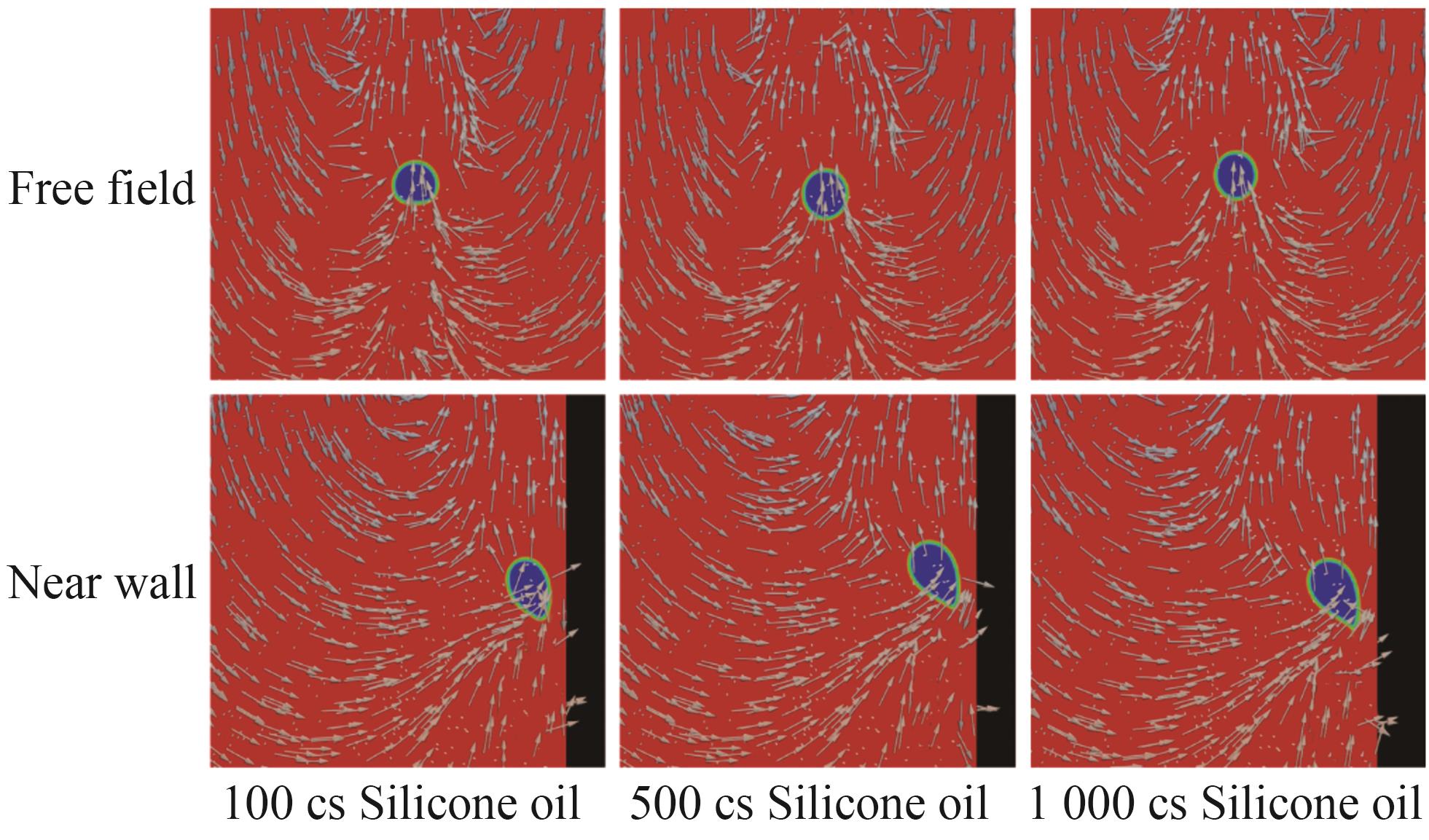 In this section, the effect of liquid viscosity on bubble motion is investigated. First, the bubbles in the free field of silicone oil with viscosity of 100, 500, and 1 000 cs are examined. Then, the bubbles near the wall in these three kinds of silicone oil are studied and compared with the experimental results. The experiment and the numerical values take the moment when the bubble just leaves the outlet as the initial moment, and the distance parameter between the bubble and the wall is