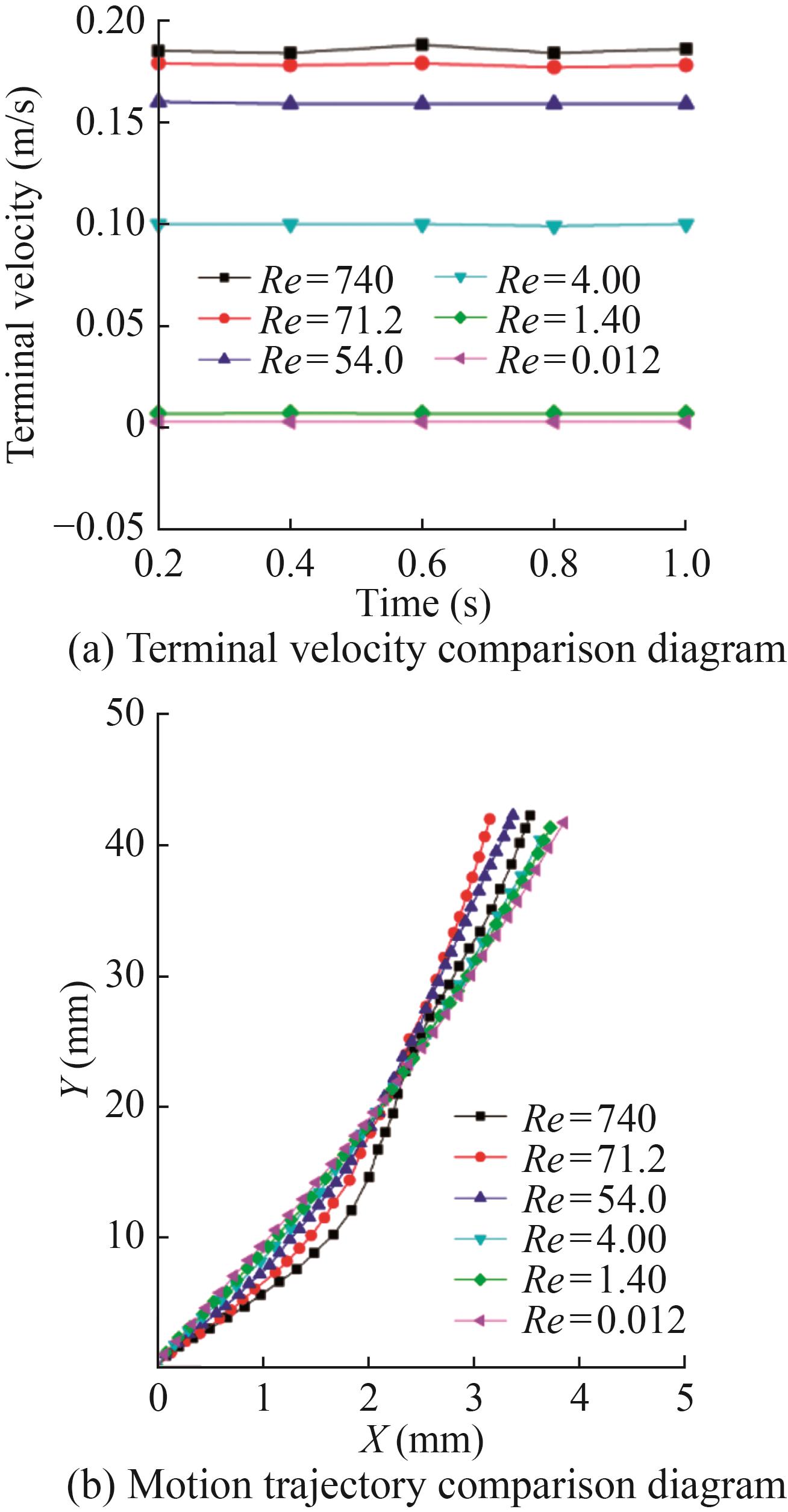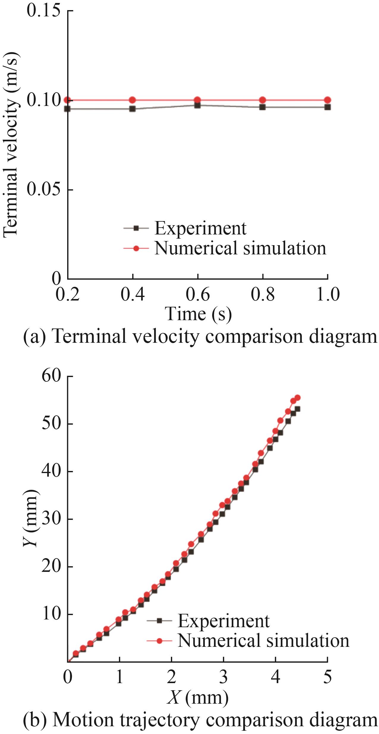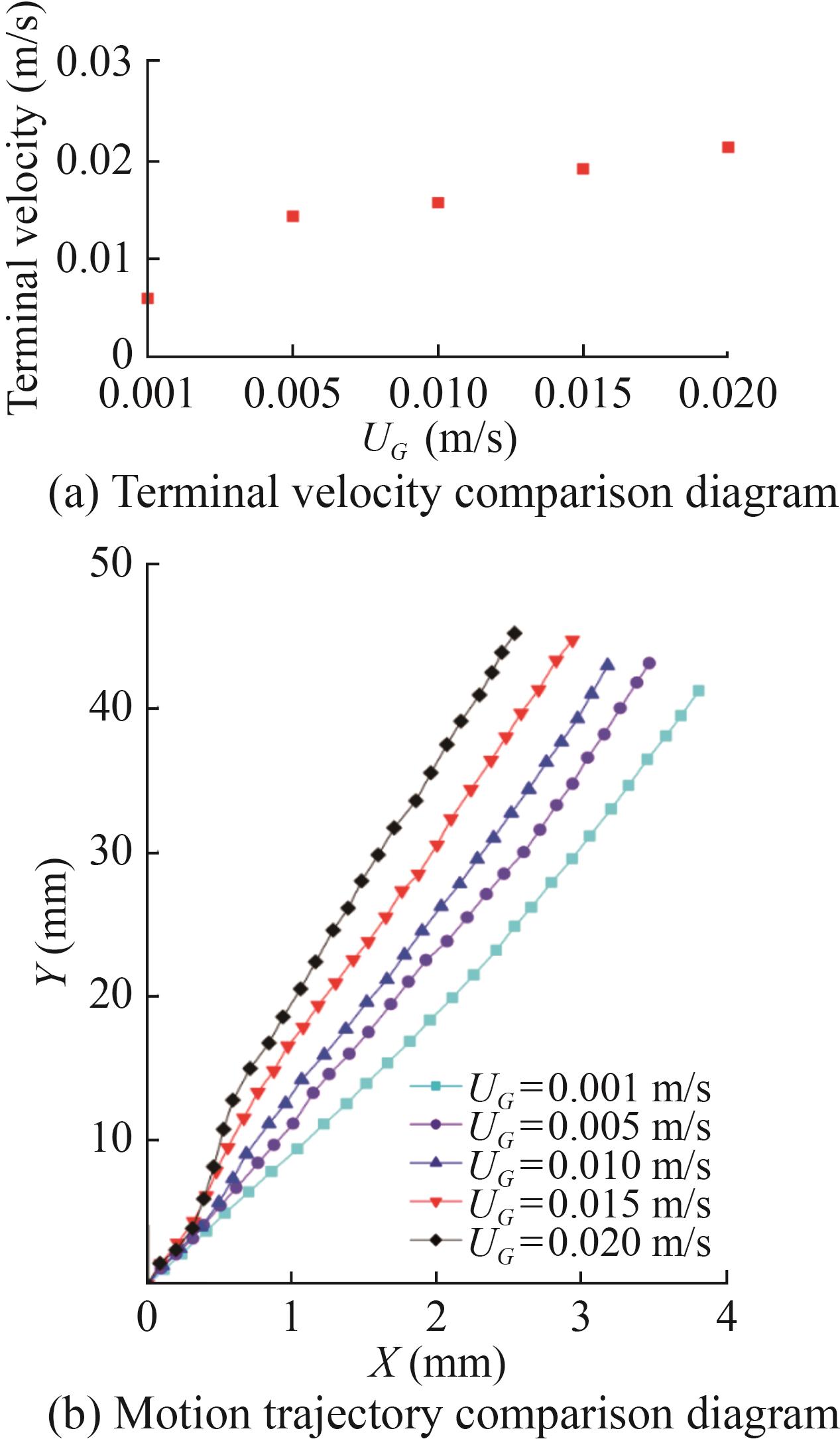 Taking the same working condition as above, the centroid of the initial shape of the bubble just leaving the outlet is taken as the coordinate origin to obtain a more intuitive comparison of bubble trajectory changes. The displacement trajectory of the bubble during floating and the terminal velocity diagram of the bubble after stable floating are drawn.