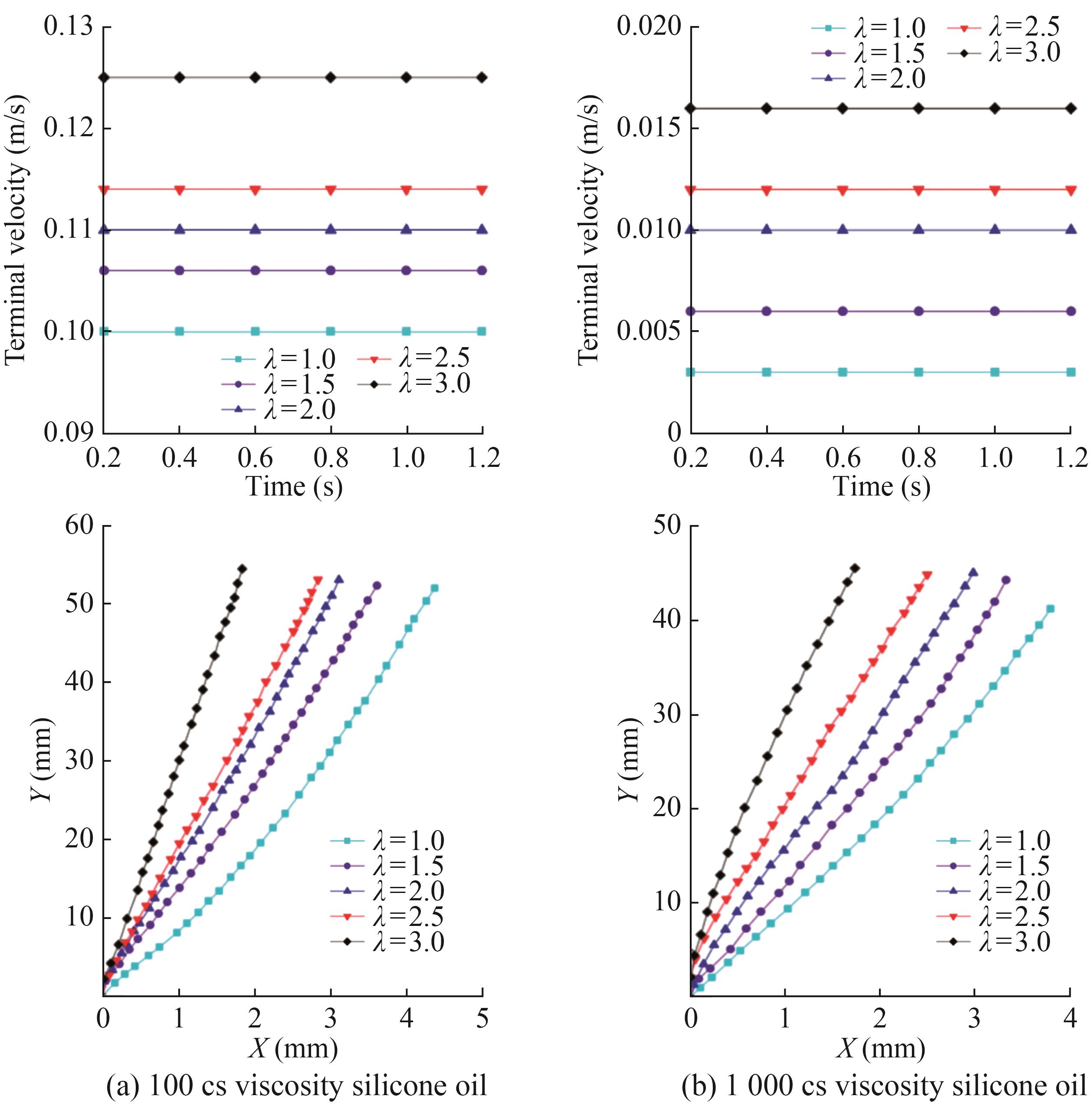 Figure 18 shows the trajectory and final velocity of bubbles with different wall distances in 100 and 1 000 cs viscosity silicone oil. The movement trend of bubbles in two kinds of silicone oil is similar with different wall distances. At a close distance, the bubble is greatly affected by the wall surface, and it migrates horizontally away from the wall at a faster speed, which results in a larger lateral displacement. As the initial distance from the wall increases, the influence of the wall on the bubble gradually weakens, the lateral migration speed decreases, and its trajectory gradually approaches a straight line. With the increase of the initial wall distance, the floating terminal velocity of the bubbles in the two kinds of viscosity silicone oil becomes faster. The difference is that in 1 000 cs viscosity silicone oil, compared with 100 cs silicone oil, when the initial distance from the wall is modified, the changes in the bubble trajectory and final velocity become smaller. At close range, the bubble trajectory in 1 000 cs viscosity is closer to a straight line. At the same wall distance, the lateral migration of bubbles in 1 000 cs viscosity silicone oil is more than that in 100 cs viscosity silicone oil, but the final velocity of floating is smaller than that in 100 cs viscosity. Therefore, the wall effect in high-viscosity silicone oil decays more slowly.