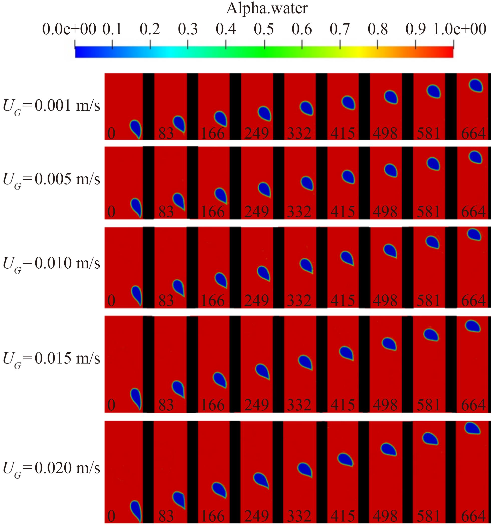 , = 0.001, 0.005, 0.01, 0.015, 0.02, in the unit of m/s, while all other parameters remain unchanged. In this section, 1 000 cs high-viscosity silicone oil is selected for analysis to explore the effect of gas flow rate on floating bubbles near the wall. Figure 19 compares the initial morphology of bubbles near the wall with different gas flow rates in 1 000 cs viscosity silicone oil. With the increase in gas flow rate, the bubbles gradually become slender when they are separated from the outlet, and the upward rebound velocity at the bottom of the bubbles also increases so that the height difference between the top and tail of the bubbles decreases. When the gas velocity is 0.001 m/s, the bubble keeps the ellipsoid shape and rises steadily. When the gas velocity reaches 0.02 m/s, the bubble shape changes from ellipsoid to cap due to the increased gas flow rate, weakened attraction of the wall surface to the bubble, and increased influence of the buoyancy at the bottom of the bubble. Thus, the rebound velocity at the bottom increases, and the bottom of the bubble becomes flat.