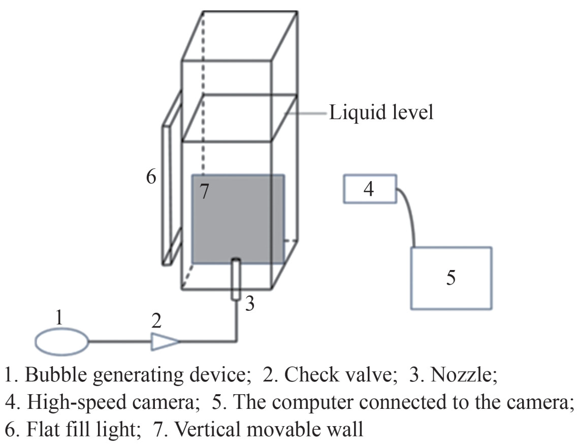 Figure 3 is the schematic diagram of the floating bubble test device. The test was completed in an open water tank. The water tank is 200 mm high, and the bottom is a square with a side length of 100 mm. The water tank and the movable wall are made of high-strength acrylic light-transmitting plate, and the side of the wall is black-marked for easy observation. The high-speed camera is VRI-PhantomV611, and 10 000 images are collected per second for 6 seconds. The light source is a flat-panel fill light, and the backlight is used to observe the bubble shape change and trajectory. The bubble generator uses a high-precision syringe, which can accurately control the flow of air to guarantee the accuracy of the experiment.