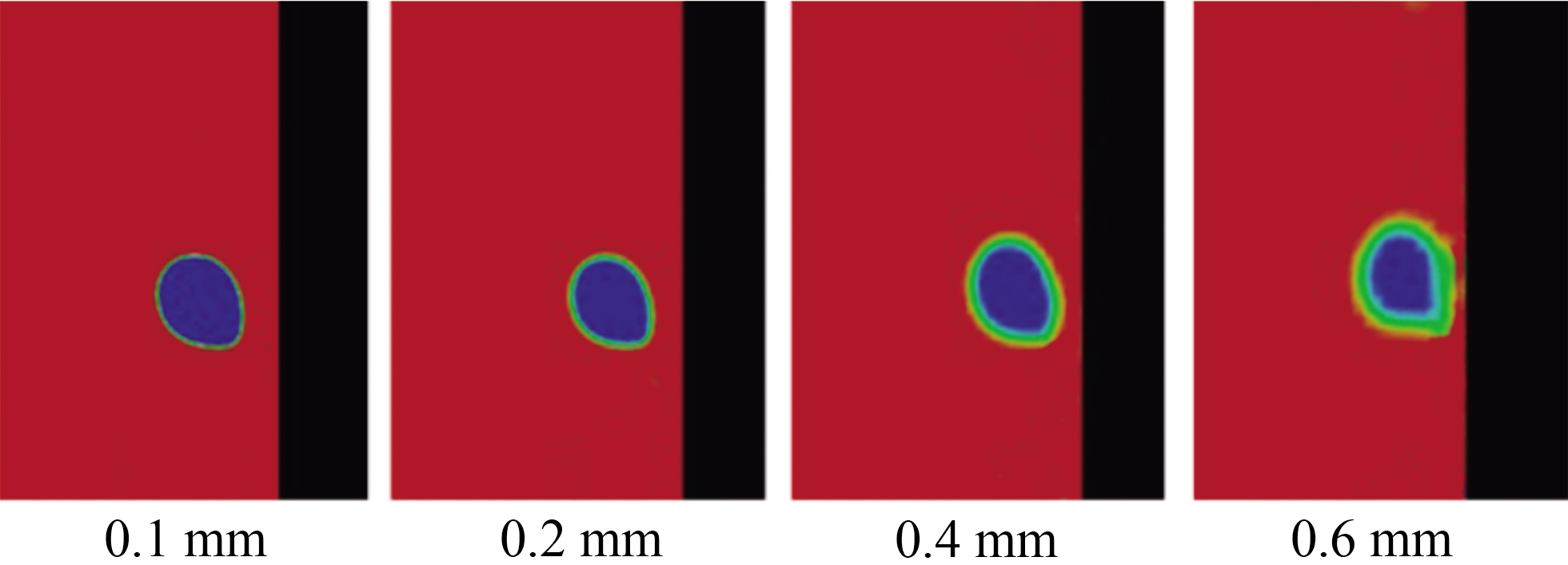 Figure 17 shows the initial morphological changes of bubbles at different wall distances in 1 000 cs viscosity silicone oil. When the initial distance is 1 times the radius of the bubble, the bottom cone of the bubble undergoes large deformation during the formation stage. During the upward bounce of the bottom, the near-wall side is subjected to evident wall-induced force, which greatly affects the contraction of the bottom, and the bottom of the bubble is obviously biased toward the wall. With the further contraction of the bottom, the height difference near the wall side becomes more apparent. With the increase of the wall distance, the influence of the wall on the bubble is gradually weakened when the bubble is just out of the outlet, and the deformation is also reduced. The bubble size is also the same as that in 100 cs, which gradually decreases with the increase of wall distance. Different from 100 cs, when the wall distance is 2.5 and 3 times the bubble radius, the influence of the wall surface on the bubble shape is further reduced, but it is not reduced to almost invisible, and a certain height difference between the two sides of the bubble is observed.