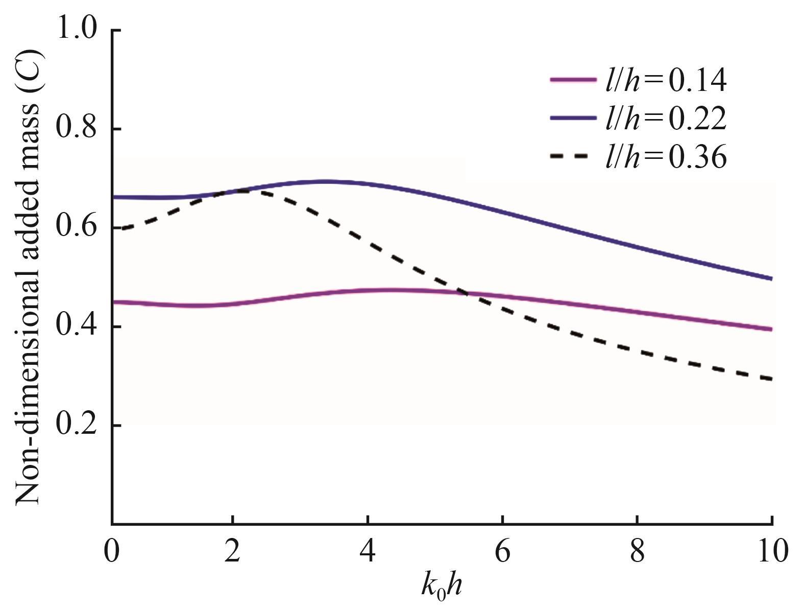 Figure 11 gives the impact of non-dimensional width $l / h$ on the $C$, with $d / h=0.18$ and oblique angle $\theta=30^{\circ}$ versus $k_{0} h$ are plotted. The added mass of heave is observed to decrease as the values of $l / h$ increases for $k_{0} h \geqslant 5$. However, this pattern does not consistently hold for smaller values $k_{0} h$.