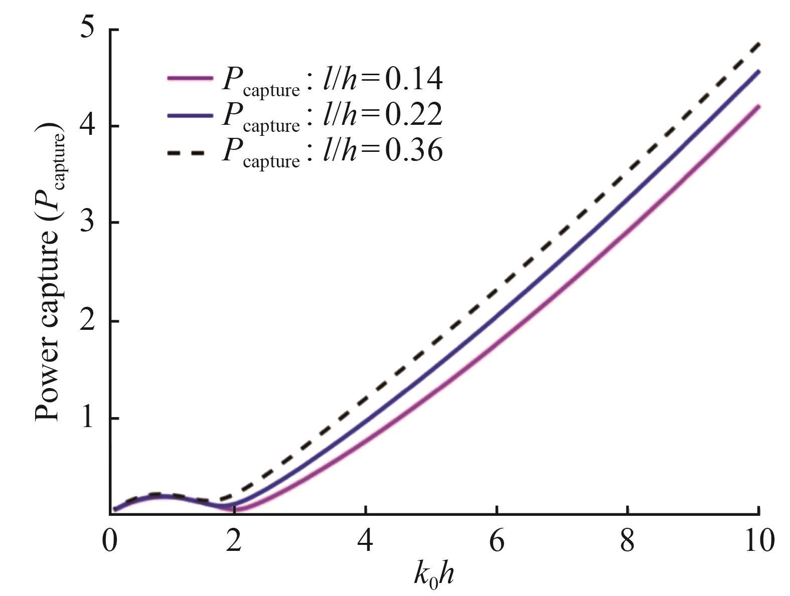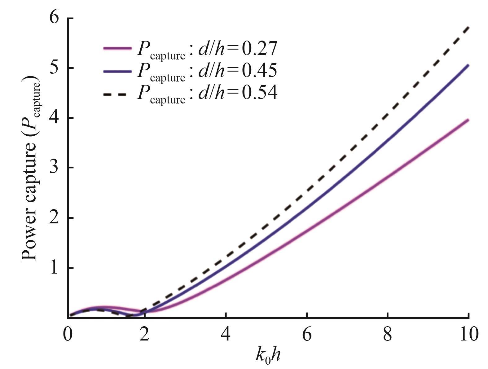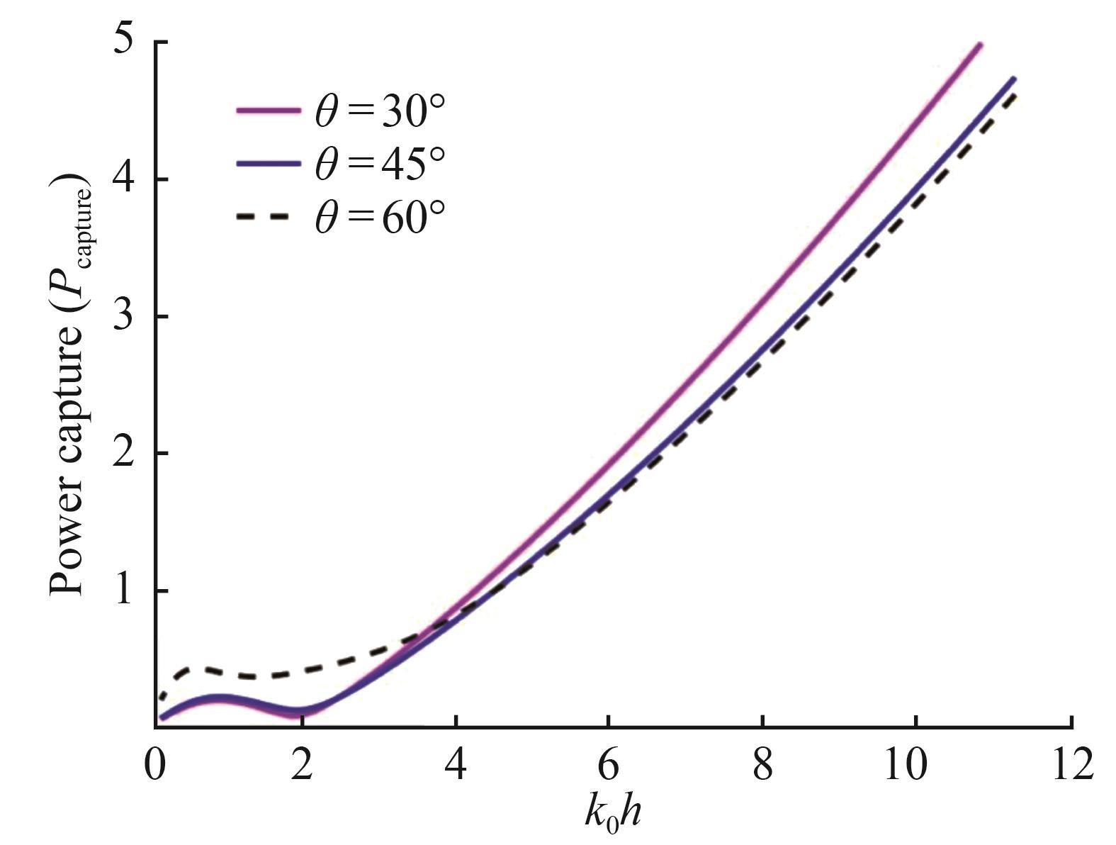 Figures 16‒17, the influence of the nondimensional draft and the width of the box on the $P_{\text {capture }}$ for oblique wave angle θ = 30° versus $k_{0} h$ are plotted. In both cases, it was seen that the power captured by the WEC becomes greater for the higher draft and wider structure as the wavenumber increases. However, this effect seems to be negligible for smaller wavenumber. This suggests that this type of wave energy system may be more effective for extracting wave energy in coastal areas.