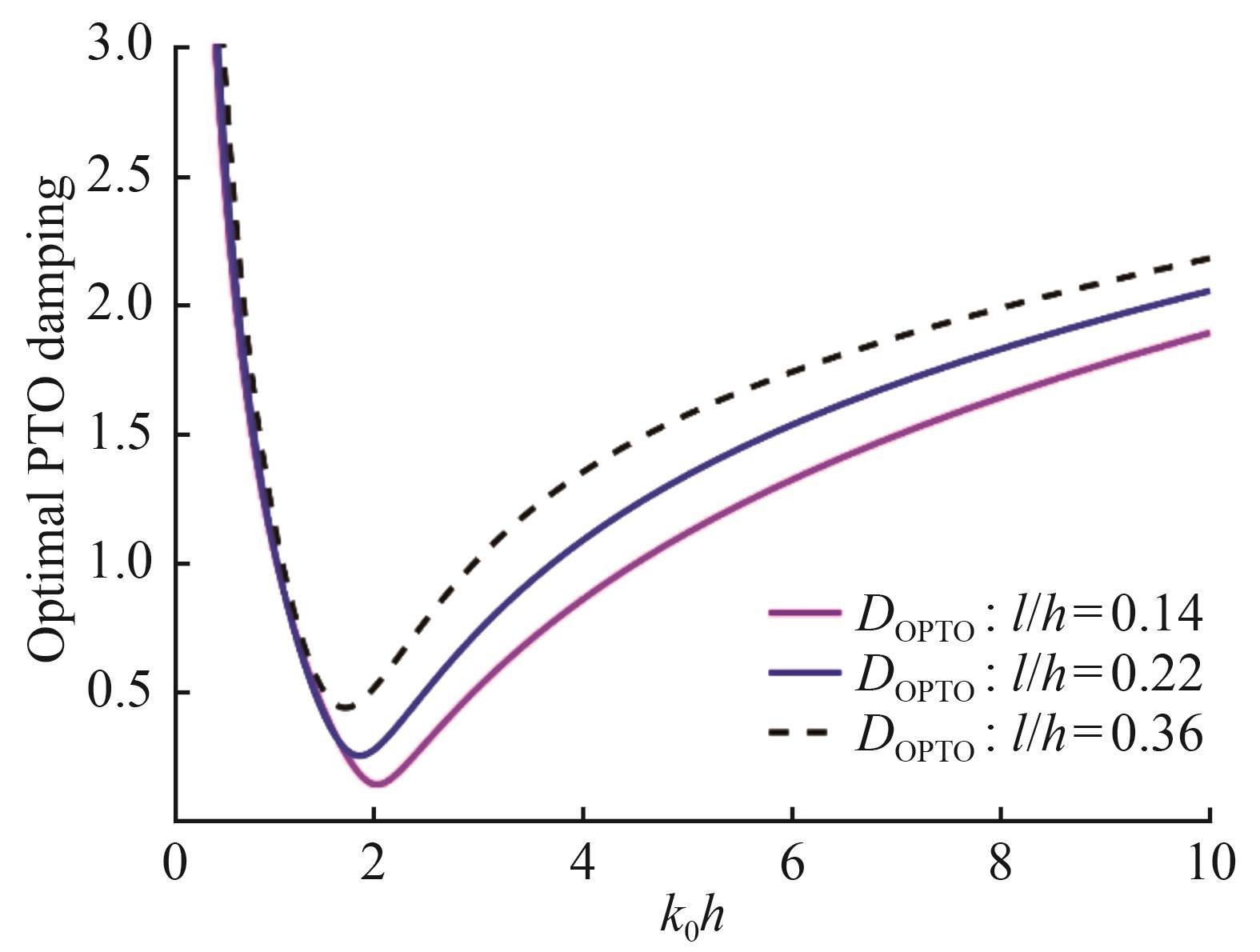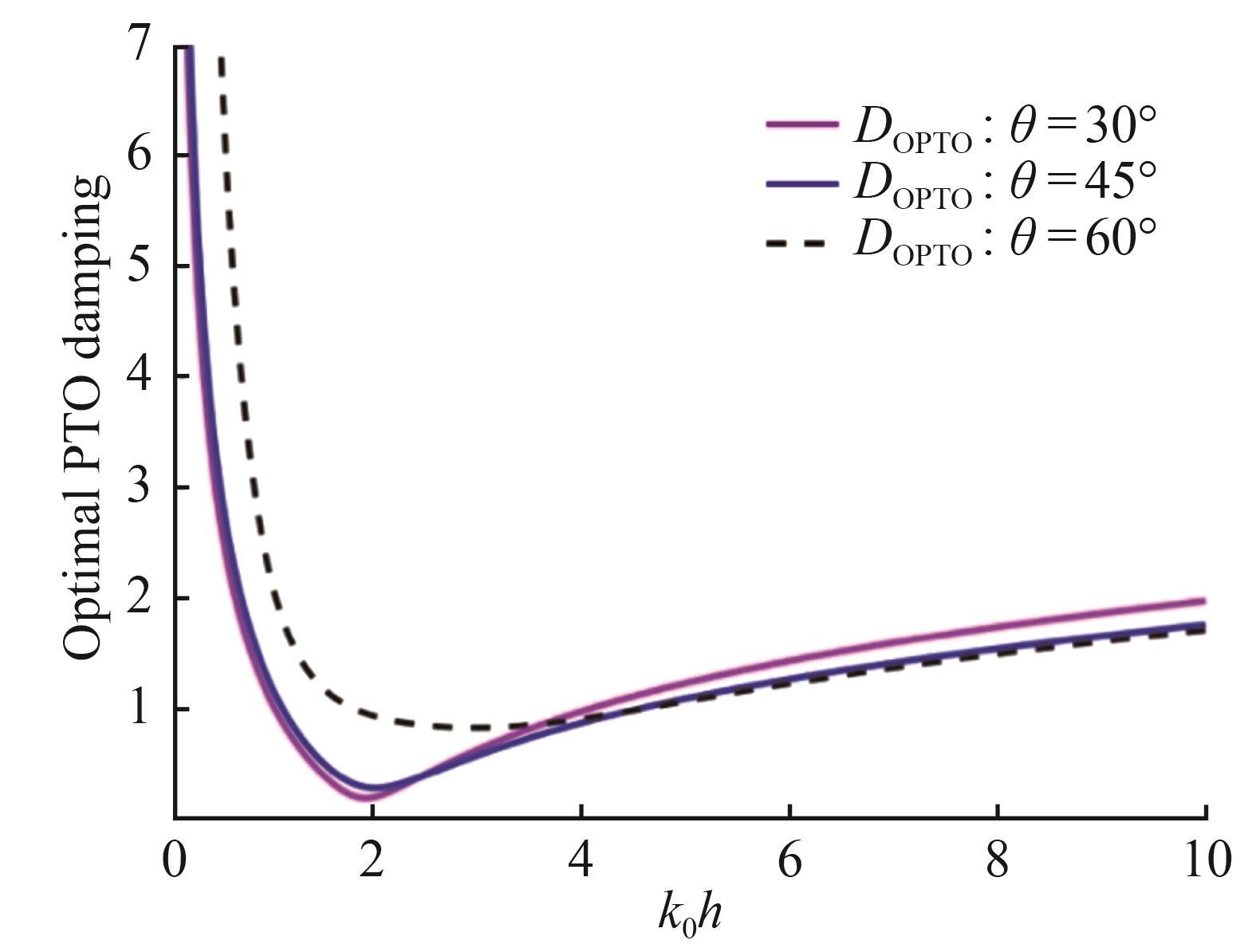 The effect of $\theta$ on the optimal PTO damping coefficient versus $k_{0} h$ is shown in Figure 18. The results indicate that higher $\theta$ lead to increased optimal damping. Nevertheless, at higher $k_{0} h$, this increase diminishes slightly, exhibiting a minor reversal. In Figures 19-20, the impact of structural parameters (draft and width) on the optimal PTO damping with $d / h=0.4$ and $\theta=30^{\circ}$ versus $k_{0} h$ are illustrated. The observations resemble those shown in Figure 16 and Figure 17.