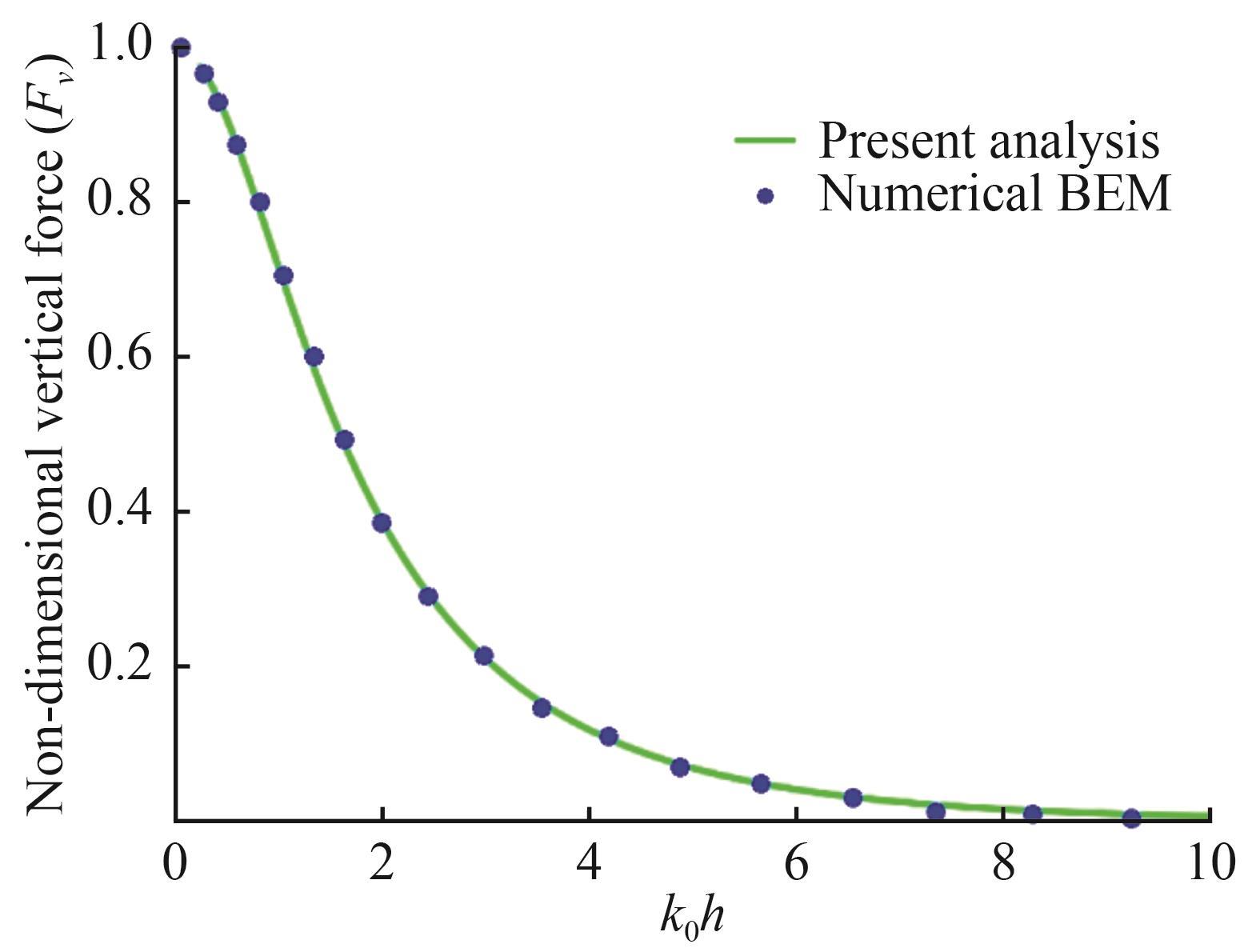 Figure 2 presents a validation of the current solution for the vertical wave force ($F_{v}$) on a heaving box (without a VFPM wall) against BEM results from Zheng et al. (2006), plotted against the non-dimensional wavenumber $k_{0} h$. The current results for the vertical force, in the absence of a VFPM wall, demonstrate strong agreement with the BEM data.