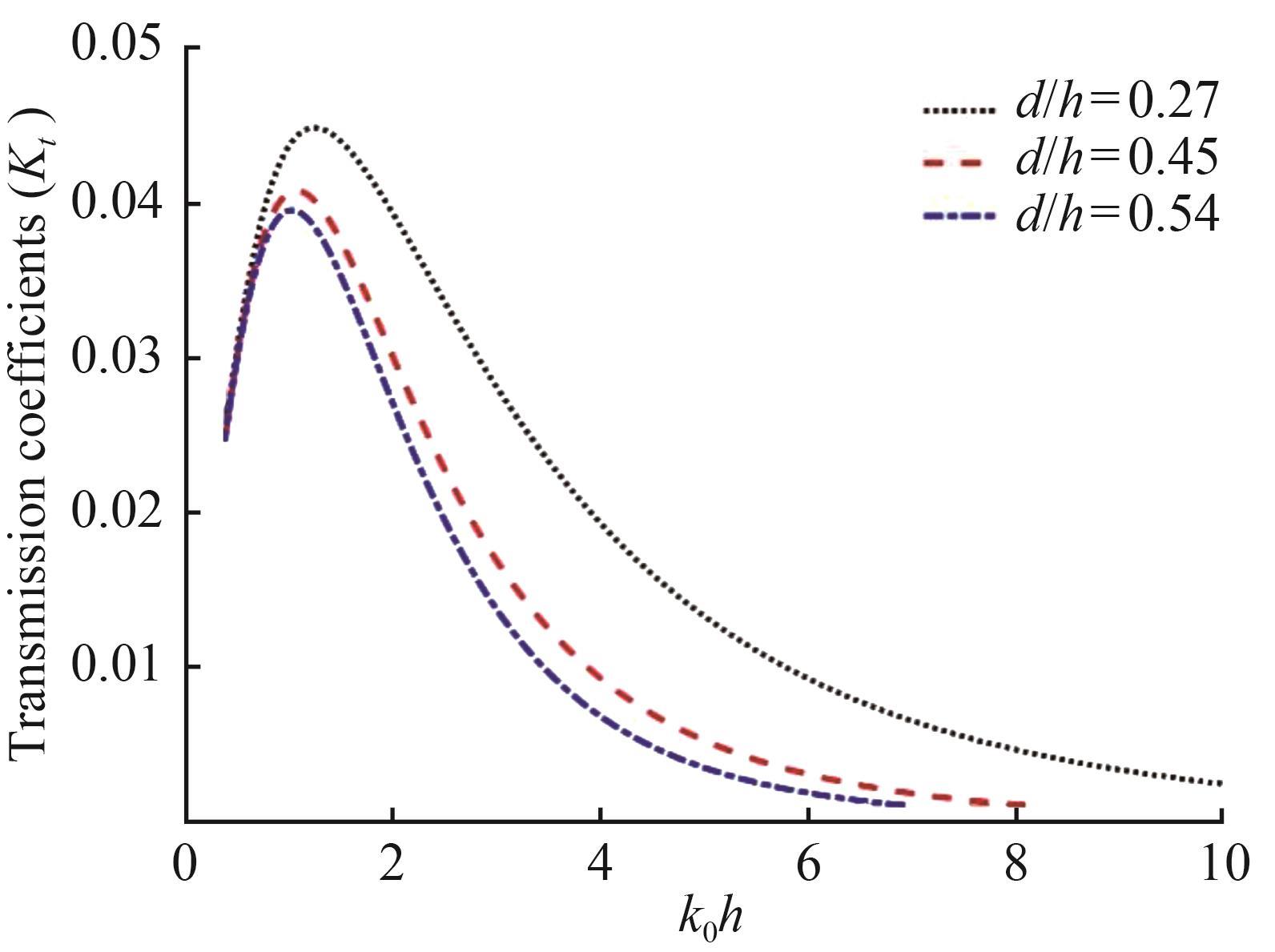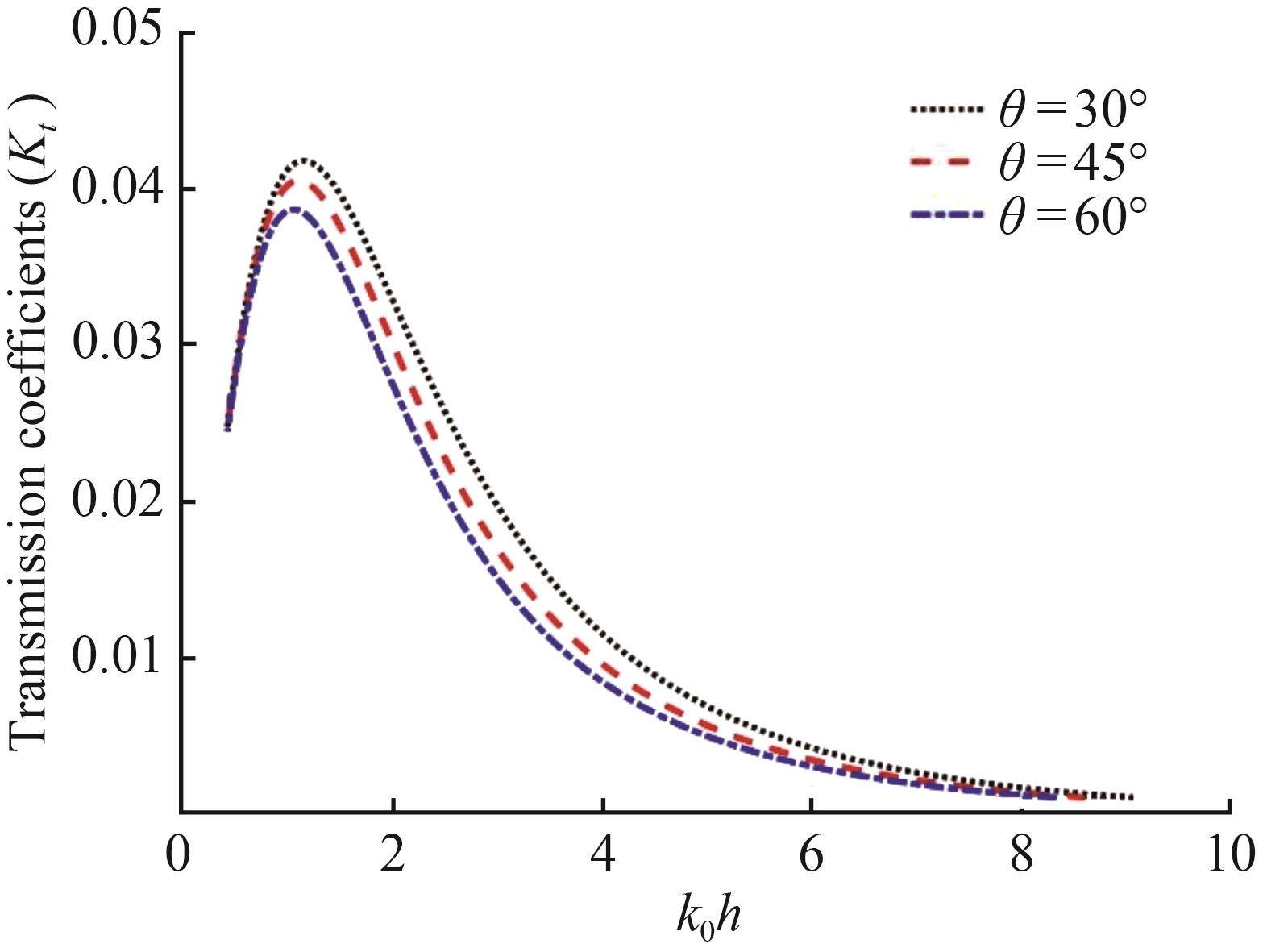 Figures 21 ‒ 23 present the impact of various oblique angles, non-dimensional structural draft, and width on the transmission coefficients Kt versus $k_{0} h$. It is seen that as the incidence angle, draft, and width of the structure increase the transmission coefficient becomes lower. Further, with larger values of wavenumber, the impact of angle and structural parameters on the Kt is minimal.