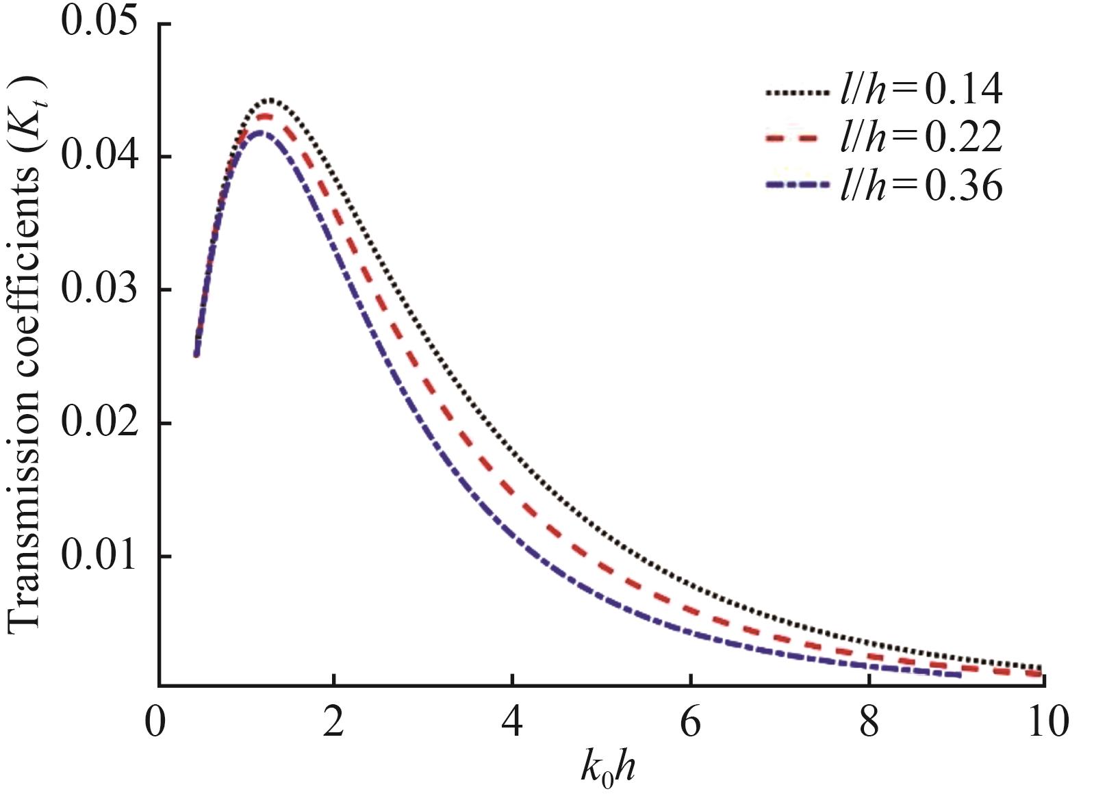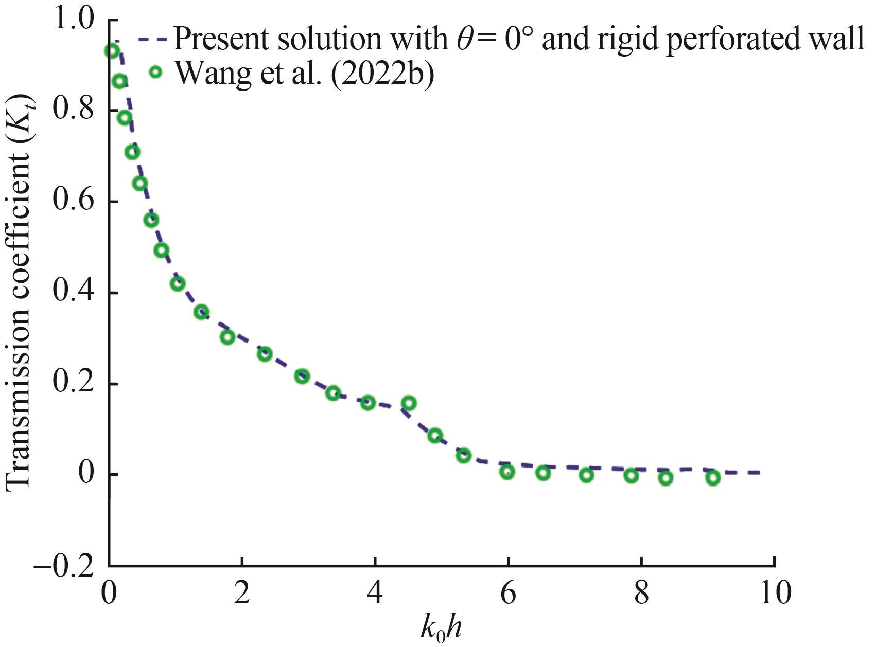 In Figure 5, the present solution of the transmission coefficient $K_{t}$ is validated with a limiting case with incident angle $\theta=0^{\circ}, l / h=0, d / h=0$, and a rigid porous wall; existing in the literature (Wang et al., 2022b) versus $k_{0} h$. It is observed that they aligned well with their pattern and data points.