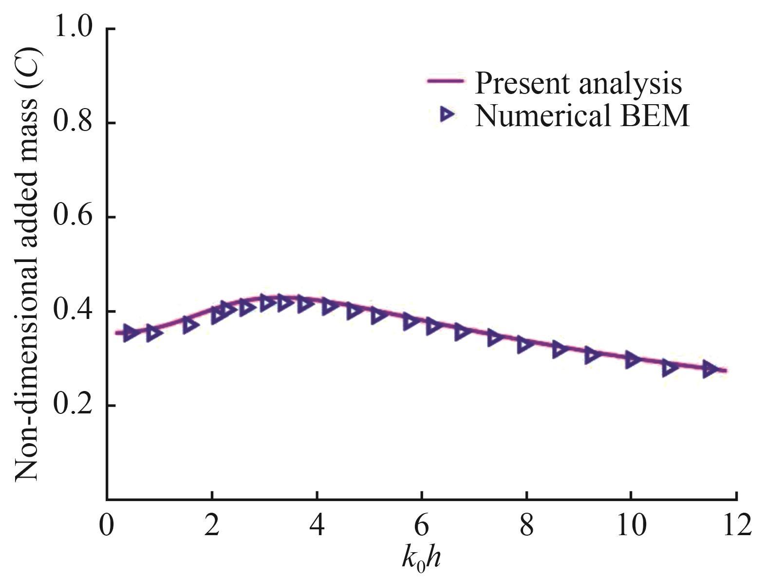 The non-dimensional added mass A (no VFPM wall) from the current solution is compared to the BEM results of Zheng et al. (2006) in Figure 3, as a function of k0h. The excellent agreement between the analytical solution and the BEM results validates the present approach, and the solution also captures the trend observed in the BEM data.
