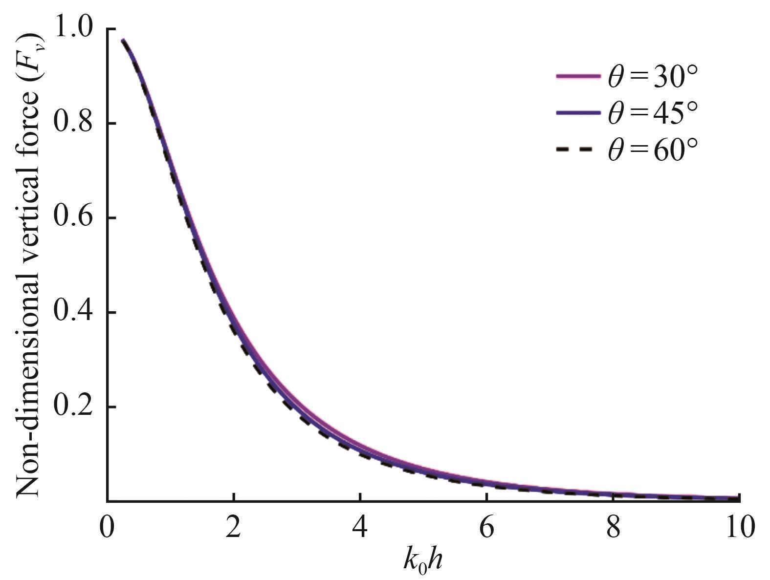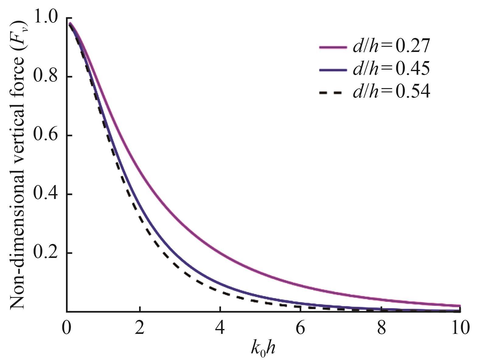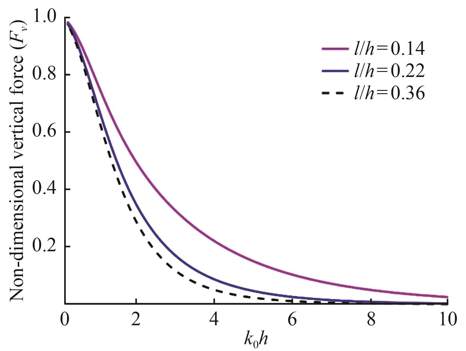 Figure 7 simulates the impact of $d / h$ on the dimensionless vertical wave force ($F_{v}$) for $l / h=0.18$ and oblique angle $\theta=30^{\circ}$ against $k_{0} h$. It can be seen that the values of $F_{v}$ increase with a decrease in d/h. The reason is that the deeper drafts create greater horizontal loads on the floating box while resulting in smaller vertical loads.