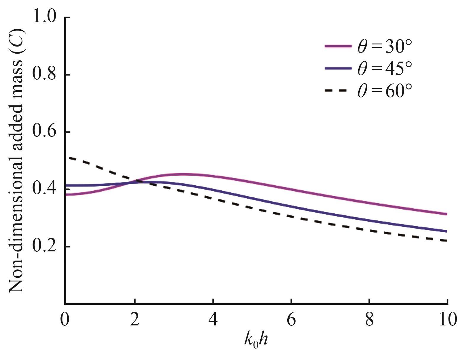 In Figure 10, the effects of non-dimensional draft $d / h$ on the non-dimensional added mass of the heave, with $l / h=$ 0.18 and oblique angle. versus $k_{0} h$ are plotted. It is observed that the added mass of heave decreases with an increase in non-dimensional draft $d / h$, which is due to the fact that higher in the draft yields larger in the mass of the structure, thus, the heave structure resonates less in heave motions.