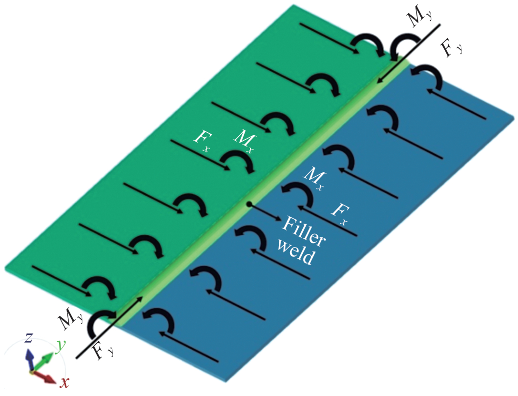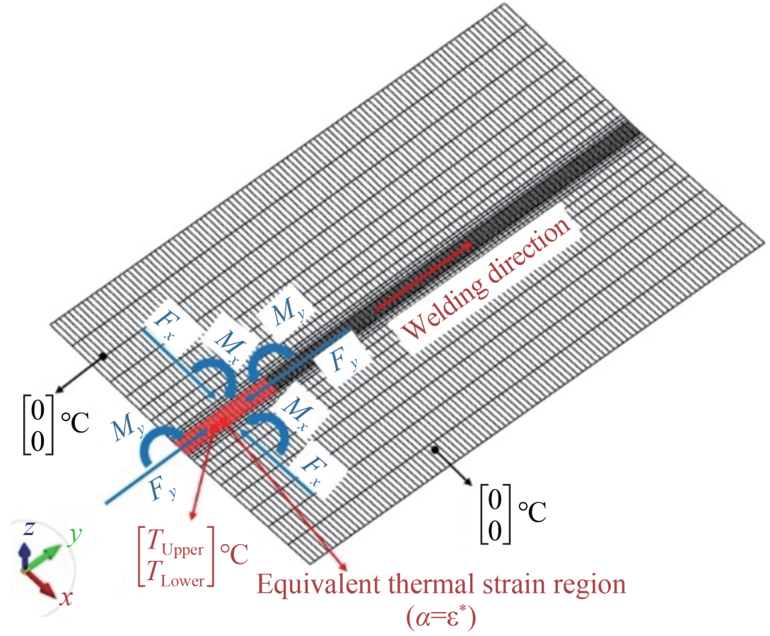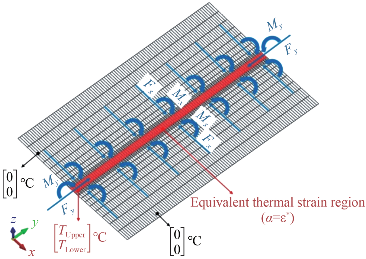 $$F_x^*=E \cdot \int \varepsilon_x^* \cdot b(z) \mathrm{d} z$$ (17) $$F_y^*=E \cdot \int \varepsilon_y^* \cdot b(z) \mathrm{d} z$$ (18) $$M_x^*=E \cdot \int \varepsilon_x^* \cdot b(z) \cdot z \mathrm{d} z$$ (19) $$M_y^*=E \cdot \int \varepsilon_y^* \cdot b(z) \cdot z \mathrm{d} z$$ (20) where Fx* and Fy* are the equivalent transverse and longitudinal shrinkage forces, respectively; Mx* and My* are the equivalent transverse and longitudinal bending moments, respectively; εx* and εy* are the transverse and longitudinal inherent strains, respectively; E is the elastic modulus at room temperature; and b(z) is the inherent strain width at the corresponding position.