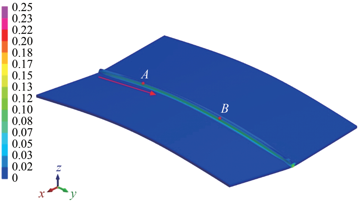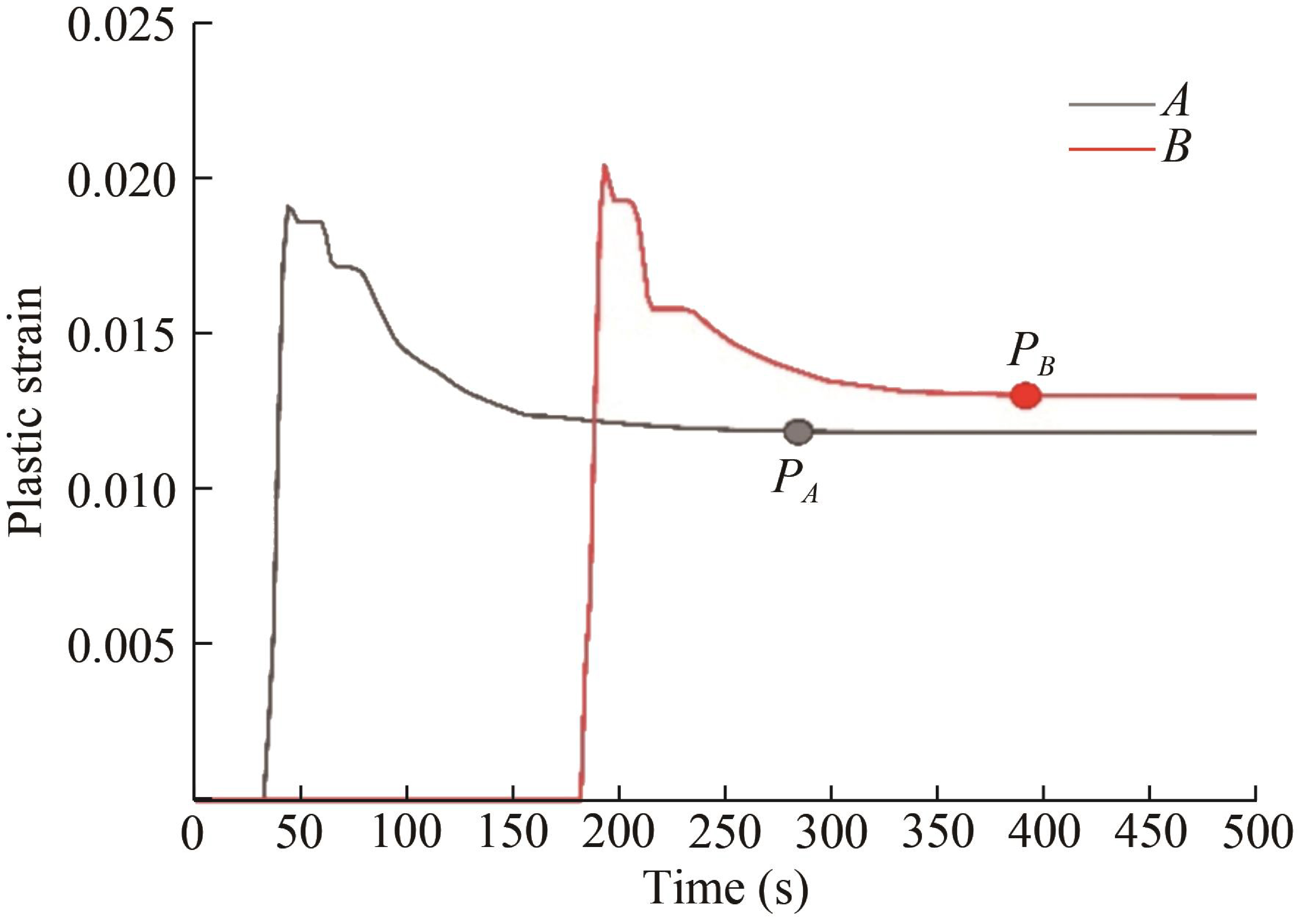 The differences in the welding deformation calculated using TG-TSM (Figures 9 and 13) arise from the fact that this method applies the inherent strain to the corresponding weld region of the finite element model all at once. The welding deformation is then obtained through a single elastic calculation. In fact, as shown in Figures 14 and 15, the heat source moves forward constantly during the welding process, and the tail of the heat source is rapidly cooled by thermal convection and thermal radiation, leading to the gradual solidification of the weld and thus a gradual shrinkage effect. To elaborate, the curve of plastic strain versus time at two selected points A and B (as shown in Figure 17; the red arrow indicates the welding direction) on the weld seam is shown in Figure 20. Time points PA and PB correspond to the moments when the weld at positions A and B, respectively, reaches stable plastic strain, also known as residual plastic strain. First, the onset of plastic strain occurs at different times for the welds at A and B during the welding process. Second, there exists a time difference between PA, when the weld at A reaches its final residual plastic strain, and PB, when the weld at B reaches its final residual plastic strain. This time difference arises because the weld at A occurs earlier, resulting in the formatting of the residual plastic strain earlier at A than at B.