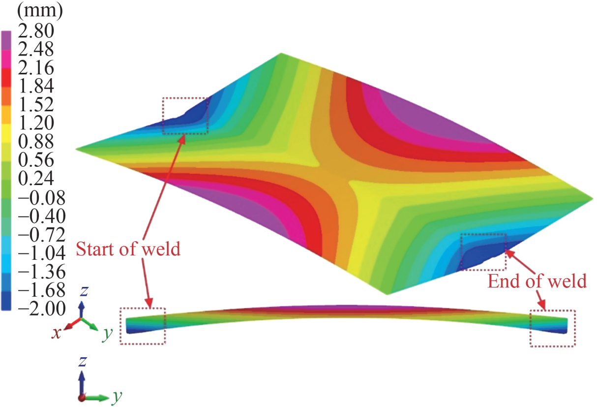 $$\varepsilon^*=\varepsilon^{\mathrm{P}}=\alpha \cdot \Delta T$$ (15) where ε* is the inherent strain, defined as equivalent to the residual plastic strain; α denotes the thermal expansion coefficient of the material; and ΔT represents the temperature difference between the melting point of the material and the room temperature (ΔT was set to 1 430 ℃ in this study). Note that the default material database in SYSWELD does not support directionally dependent coefficients of thermal expansion. Therefore, the average residual plastic strain was utilized in this study.