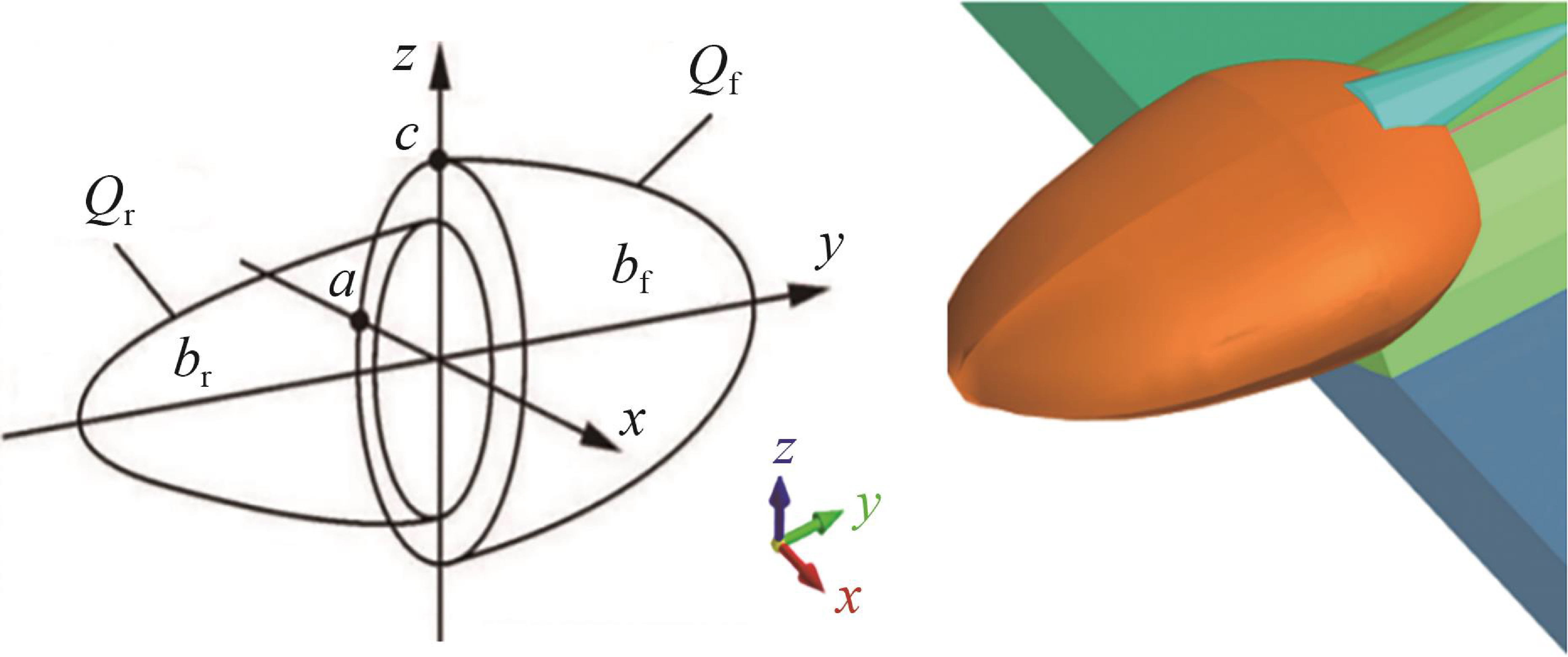 $$\begin{aligned} & Q_{\mathrm{r}}(x, y, z, t)= \\ & \;\;\quad \frac{6 \sqrt{3}\left(f_{\mathrm{r}} \eta U I\right)}{a b_{\mathrm{r}} c \pi \sqrt{\pi}} \exp \left(-\frac{3 x^2}{a}-\frac{3(y+v t)^2}{b_{\mathrm{r}}^2}-\frac{3 z^2}{c^2}\right)\end{aligned}$$ (3) Here, ff and fr represent the heat distribution functions, where ff+fr=2; bf and br are the lengths of the front and rear half-ellipsoids, respectively.