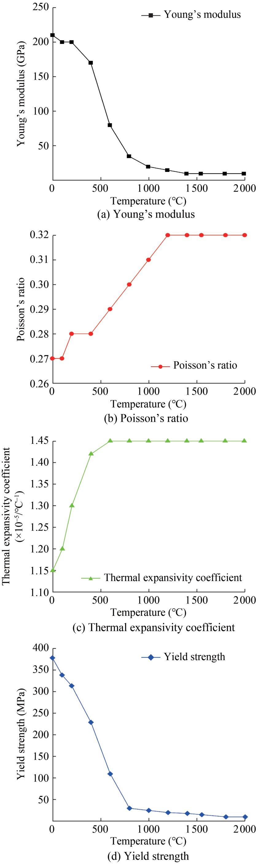 In this investigation, the welding process was simulated via the TEP-FEM approach within a coupled thermal-metallurgical-mechanical multiphysics framework. The thermal analysis results were sequentially applied as initial mechanical loads within the same finite element model to compute the strain, displacement, and stress fields throughout the welding cycle (Hashemzadeh et al. 2022; Ghafouri et al., 2022). The temperature-dependent mechanical properties, as shown in Figure 7, were required to perform the mechanical calculations (Zhou et al., 2022; Gao, 2020). The impact of phase transformation on plasticity was considered in the mechanical calculations. Further, the elastic stress-strain association of the material was assumed to conform to Hooke's law, and the plastic feature to the Von Mises criterion. Accordingly, the stress-strain relationship can be described as follows (Ghafouri et al., 2022; Li et al., 2021):