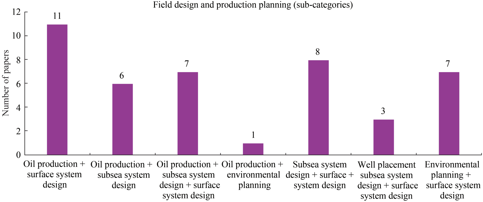 Considering the above sub-categories, Figure 11 presents the number of papers for all subcategories. It can be seen that the integrated decisions of "oil production and surface system design" and "subsea system design and surface system design" are the most studied ones, accounting for about 50% of the papers presented in this category. "Oil production and subsea system design" and "oil production, subsea system design and surface system design" are equally studied in the literature. Furthermore, the "environmental planning and surface system design" decisions are well integrated in the literature, whereas the "well placement and production, subsea system design and surface system design" decisions and the "oil production and environmental planning" decisions are the least discussed in the literature.