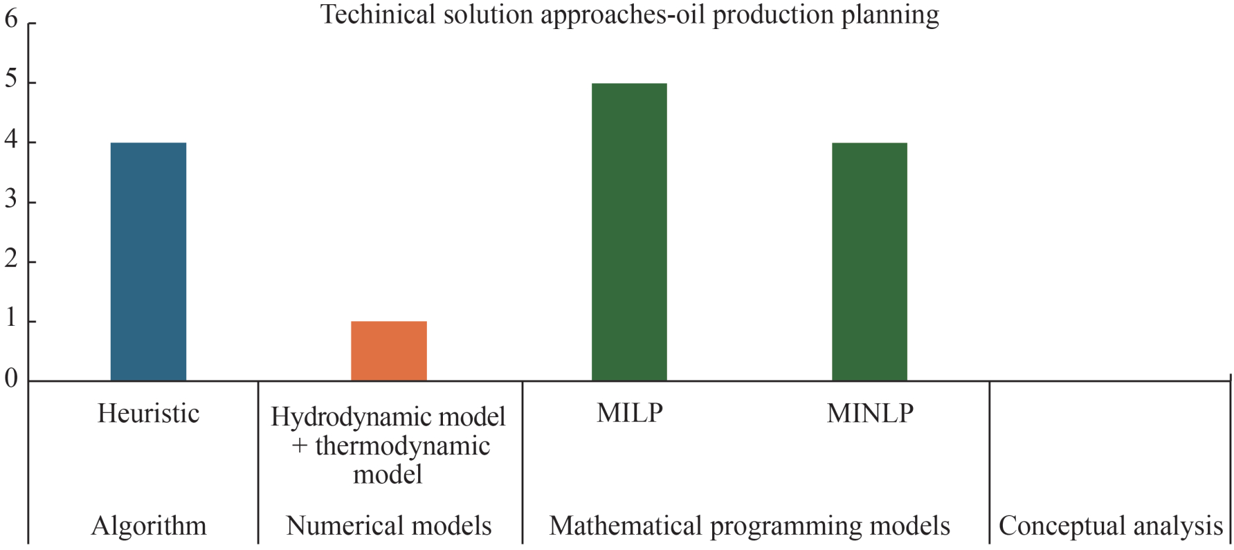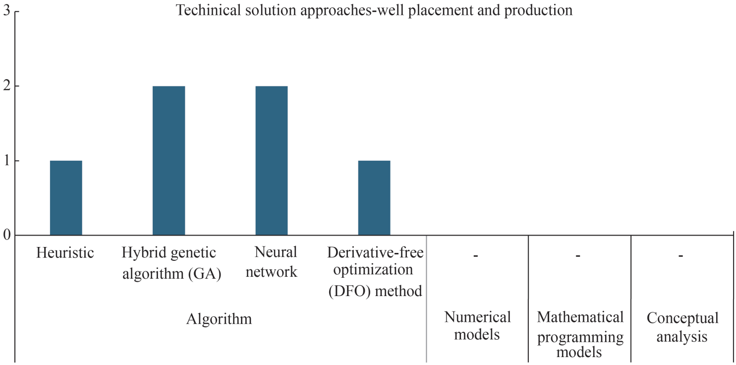 For the "long-term production decisions", the most widely implemented technical solution was the algorithm, specifically the binary, derivative-free and differential evolution algorithms. The other most widely used approach was the mixed integer nonlinear programming model. It is comprehensive that these methodologies have been adopted due to the non-linear dynamics of an oilfield.