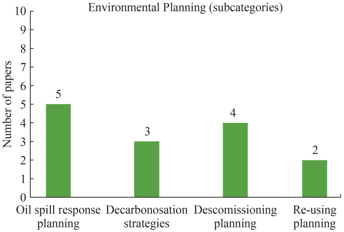 The category of environmental planning decisions accounts for 14 papers. The main objective of these works is to plan, analyse and evaluate environmental decisions relating to the development of an offshore oilfield. This includes planning the environmental response in the event of an oil spill, determining the most appropriate time for decommissioning oilfield infrastructure and planning logistics, implementing the reuse of infrastructure, and developing an adequate strategy for reducing the carbon footprint of an offshore oilfield development, These topics are classified as follows in the present paper, and Figure 20 presents the number of papers published in each subcategory: