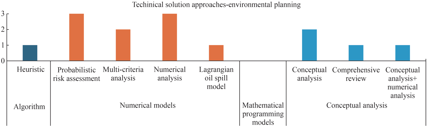 Whereas, in the subcategory of "well placement and production, subsea system design and surface system design decisions", the technical solution and approaches used are the integer linear programming model, the mixed integer linear programming model and the constrained optimization by linear approximation, respectively. Furthermore, multi-objective mathematical programming is the most adopted technical solution approach in the "environmental planning and surface system design decisions", but other numerical models were considered, as well as the lifecycle extension decision framework, process simulation, quantitative economic performance, and one conceptual environmental analysis.
