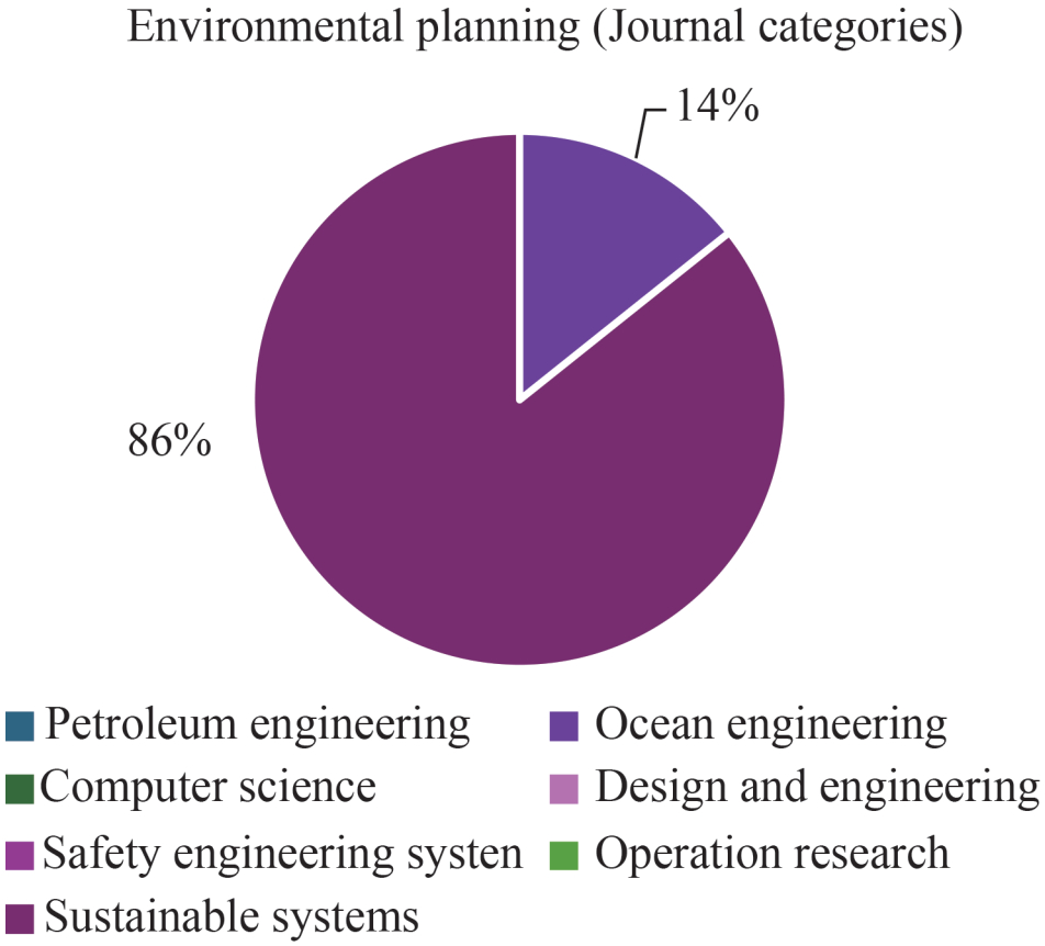 Figure 21 and Figure 22 present the technical solutions and approaches used in the respective subcategories, as well as the number of papers and the categories of journals in which the published works appeared. Numerical models are widely adopted in most papers. The second most common approach is conceptual analysis, followed by algorithms. As can be seen, mathematical programming models are not used in the decision-making processes. Also, most of the papers were published in the journal' category of "Sustainable Systems". Followed by articles published in the "Ocean engineering" category.