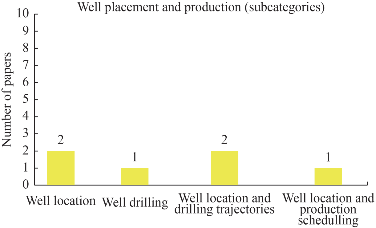 The "wells placement" decisions only accounts for 6 papers included in the respective category. Therefore, due to the small number of papers, the subcategories do not provide a more systematic analysis. Therefore, in terms of the scope of the paper, it would be interesting to investigate how well placement decisions impact the design of the offshore production system, for example the subsea layout concepts or the location of the surface platform. Additionally, analysing how uncertainty in the drilling target, the volume of oil in place, and the oil price may impact the well drilling method (vertical or horizontal) would be worthwhile.