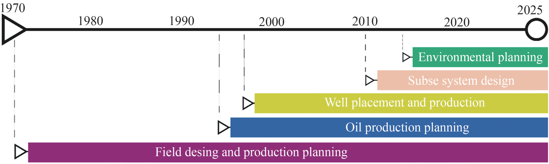 Continuing with the general analysis of the papers, it was also possible to identify the evolution of oilfield development decisions over the years. Figure 4 presents the development categories and their respective starting dates. As it highlights, from the 1970s to the 1990s, field design and production planning were the main focus of the decision-making process, i.e. design and/or operation decisions were combined with the aim of improving the feasibility studies of field development. Subsequently, during the 1990s to 2010s, decisions such as estimating the production profile, location, number and drilling trajectories of wells, which can be considered as operational planning decisions, were taken, probably in an attempt to increase the recoverable volume of hydrocarbons while reducing the complexity of deep to ultra-deep-water operations. Thus, from the 2010s to present, the design decisions regarding the subsea production system and the environmental strategies and planning decisions also appear as main important issues discussed in the literature.