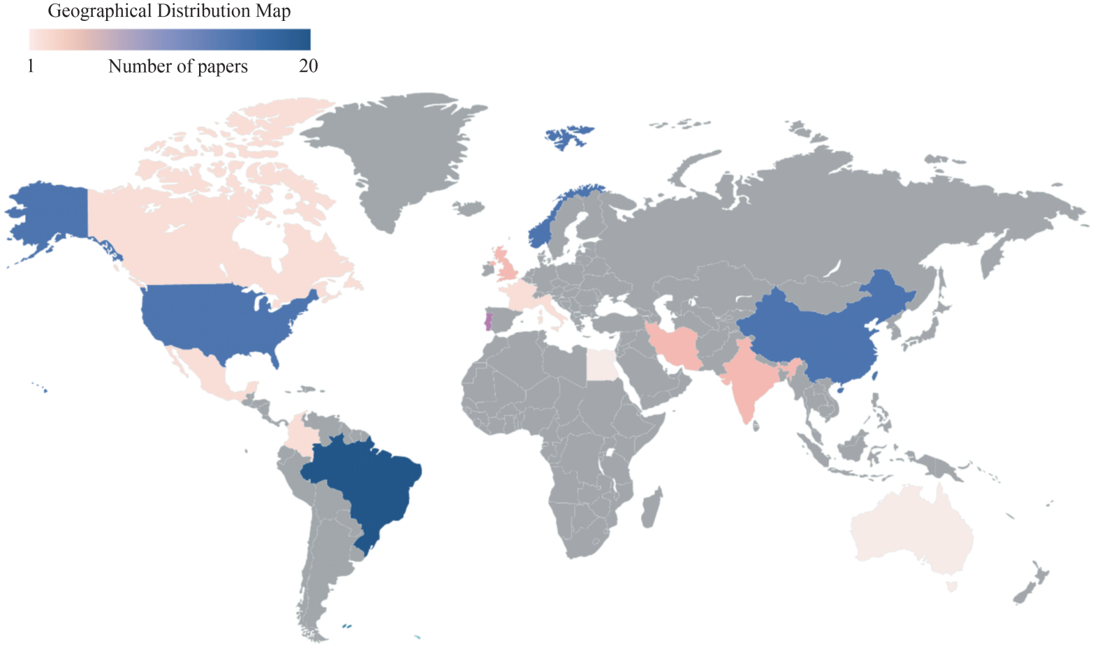 Another important analysis to be performed is that of the spatial and temporal evolution of the research articles. Firstly, 67% of the analysed articles were from the fourth most important offshore oil-producing countries, in terms of the number of articles published per country. Brazil published the most articles (20.61%), followed by China (16.49%), the United States of America (15.46%) and Norway (14.43%). Figure 5 presents a geographical distribution map based on the number of papers per country.